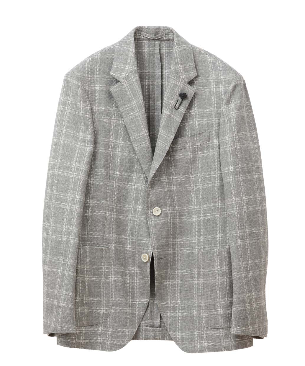 「グレンチェックは大好きな色柄なんだけど、いまの気分としては柄が立つより、密やかに着たい気分。だから、ここまでダークに落とした柄にしているんだ。先程のダブルも同じポリエステル×ウールにストレッチを混紡しているイージーケア素材で、伸びるしシワにならないのも気に入っている点。今日はグレーのニットで、モノトーンにまとめたけど、チャコールのスラックスでタイドアップにしても大人な印象が出るんじゃないかな。」