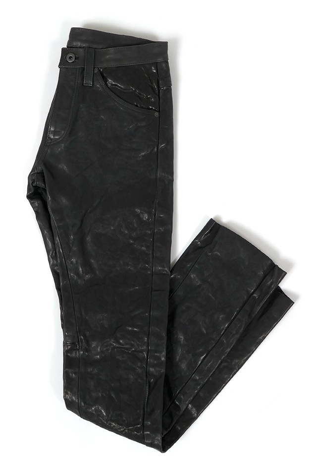 コチラのモデル「ITALY SHOULDER “GARMENT-DYED” PANTS No.1254-08」は全体的にタイトフィットでシャープな脚線美を意識したタイトストレートシルエットのレザーパンツ。