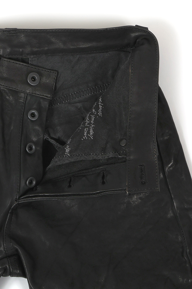 フロントボタンフライ、レザーパンツとして他に類を見ないインパクトのある一本になっています。