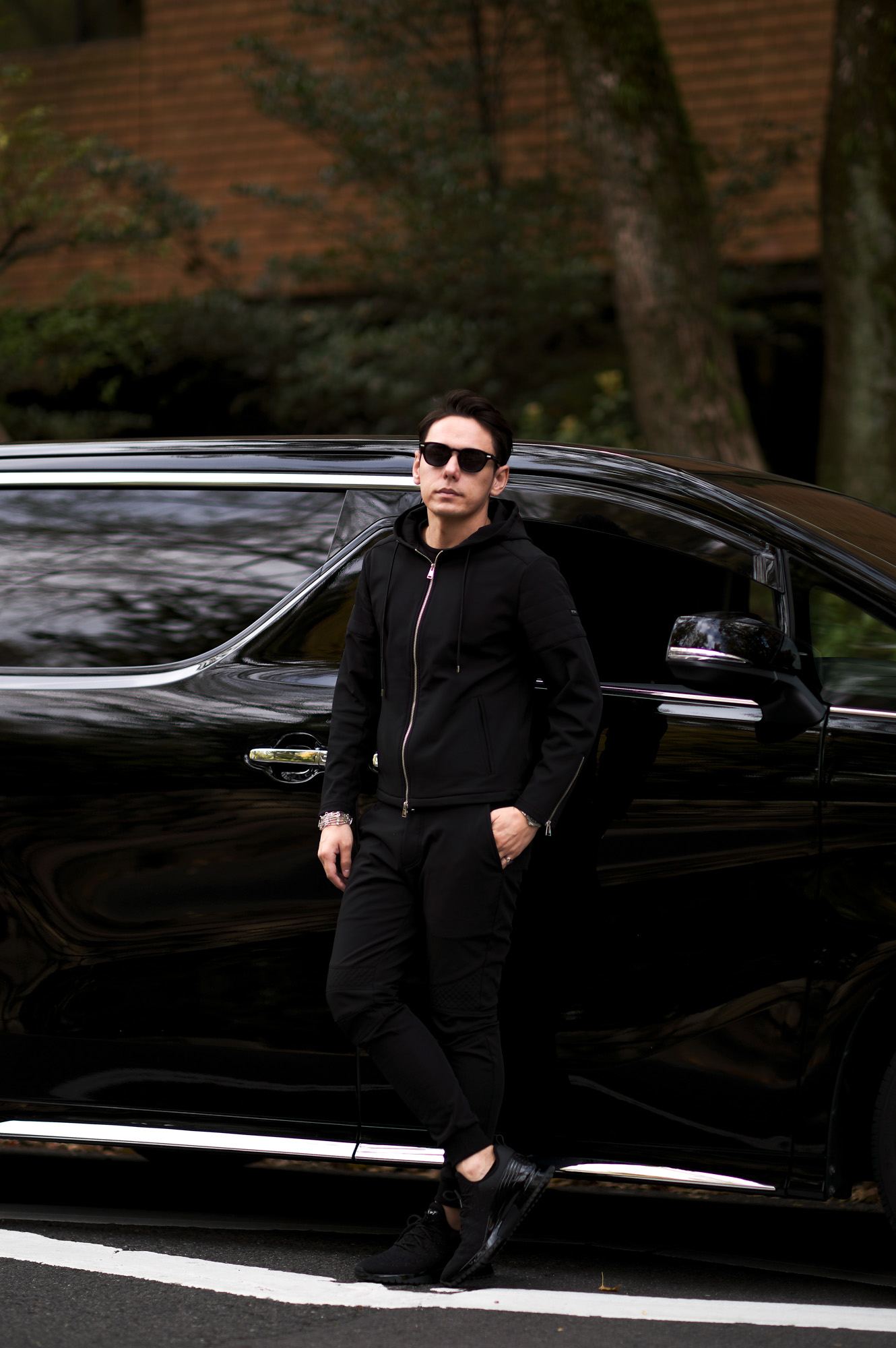 同素材のライダースパーカーと合わせたトータルルックがおすすめです。