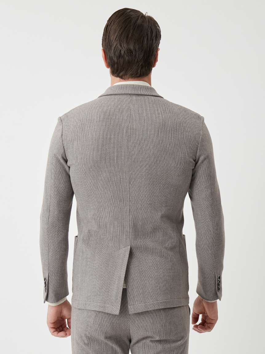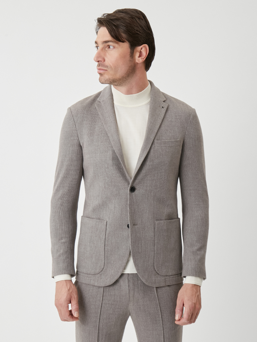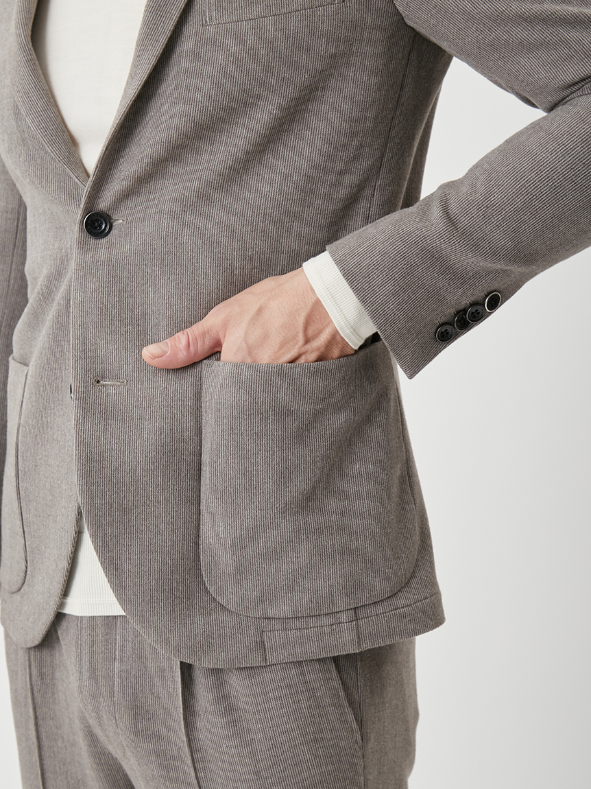 上品な起毛ストライプ素材で仕立てたセットアップ。