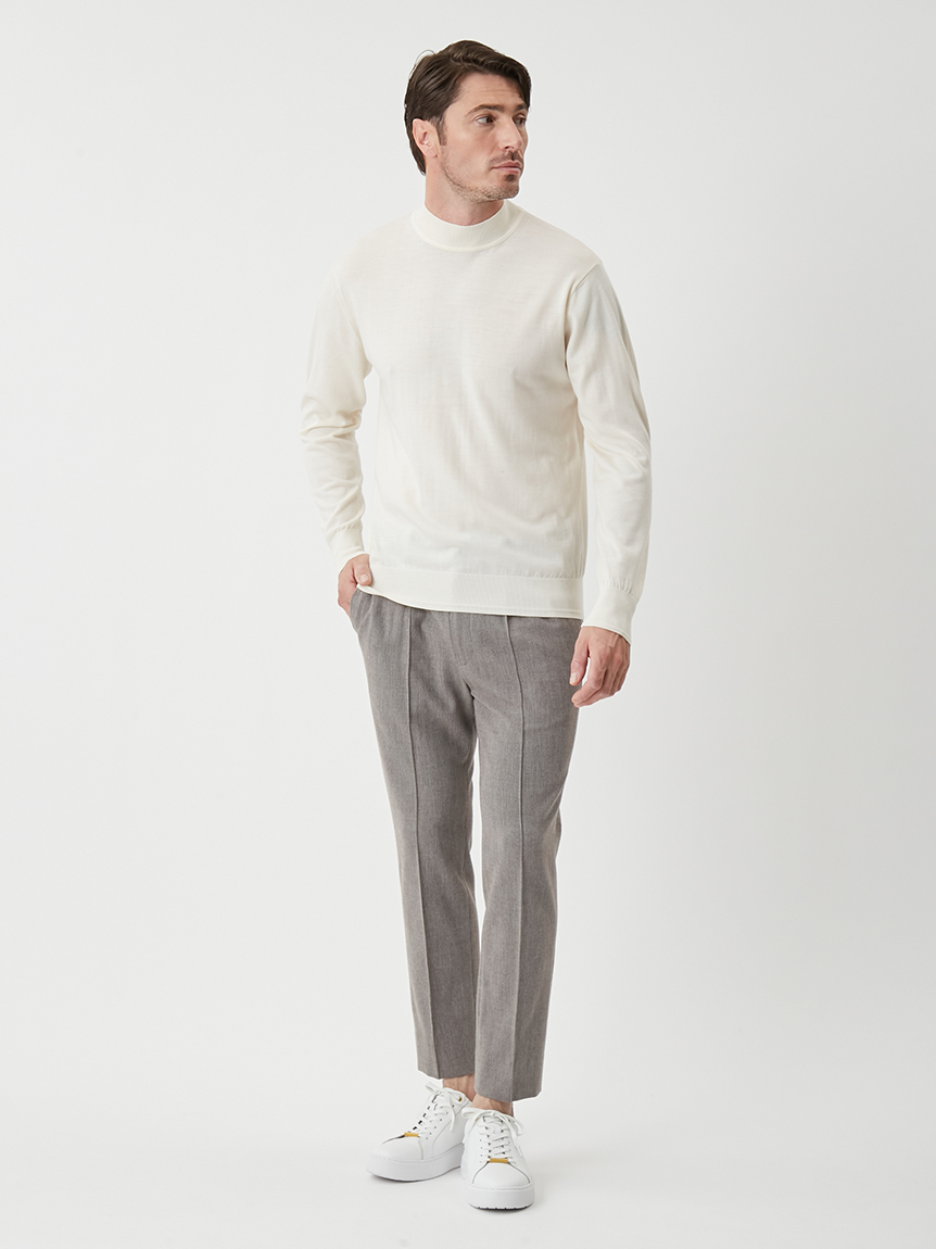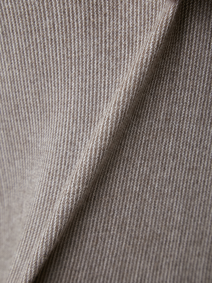 遠目には無地のように見えるほど繊細なストライプが、奥行きのある表情を生み出します。スタイリッシュな印象と、起毛素材のぬくもりを両立。