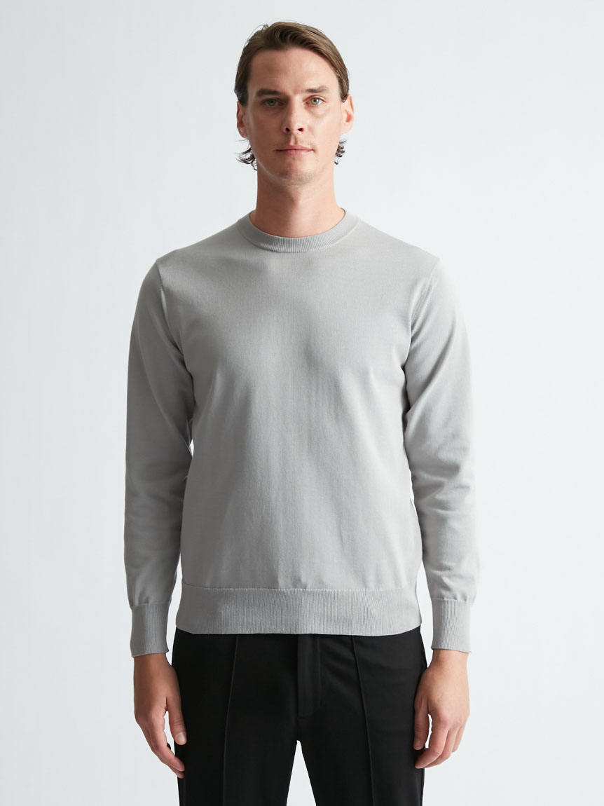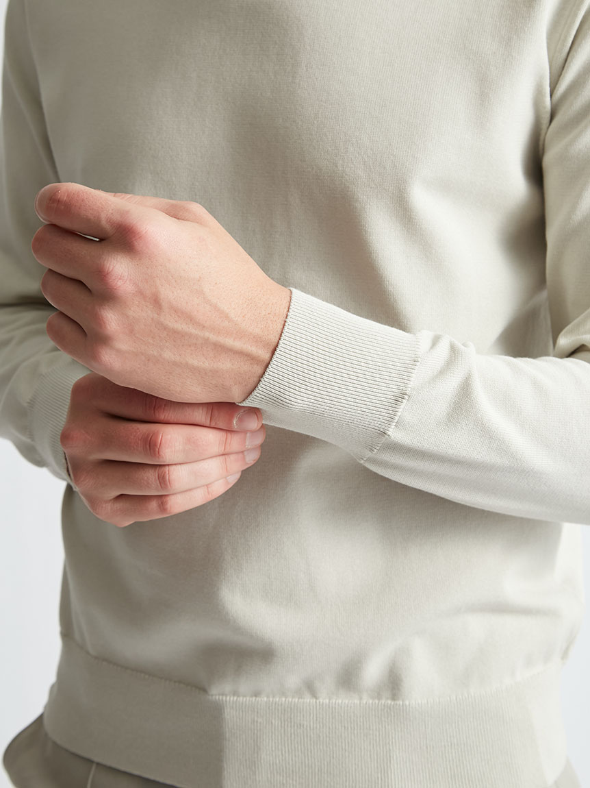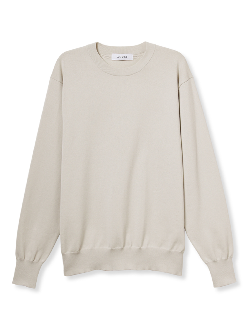 クルーネックは、ネックラインのリブ幅やテンションを繊細に調整し、詰まりすぎず開きすぎないバランスに。
