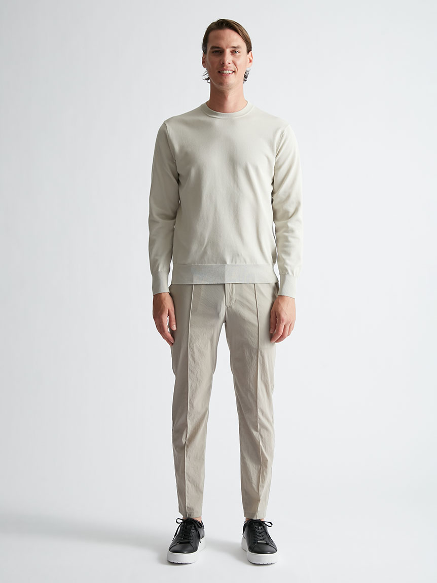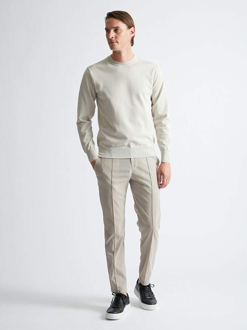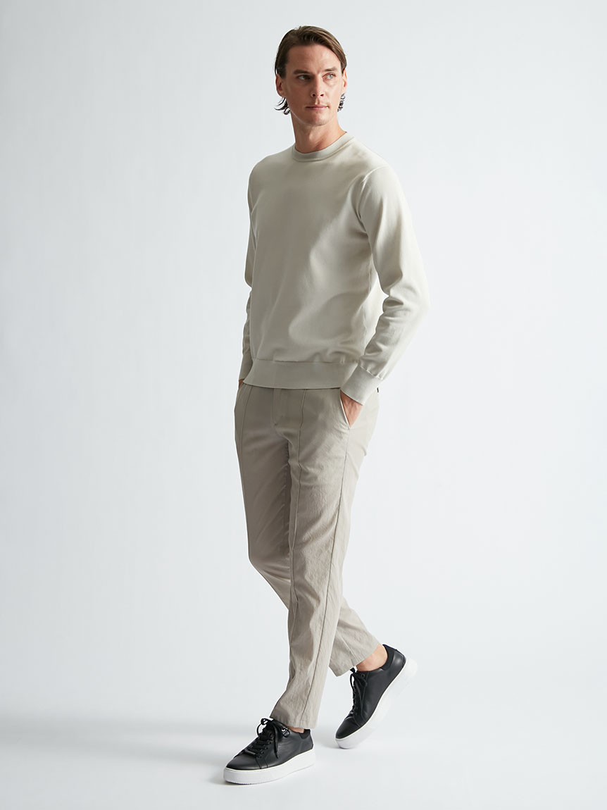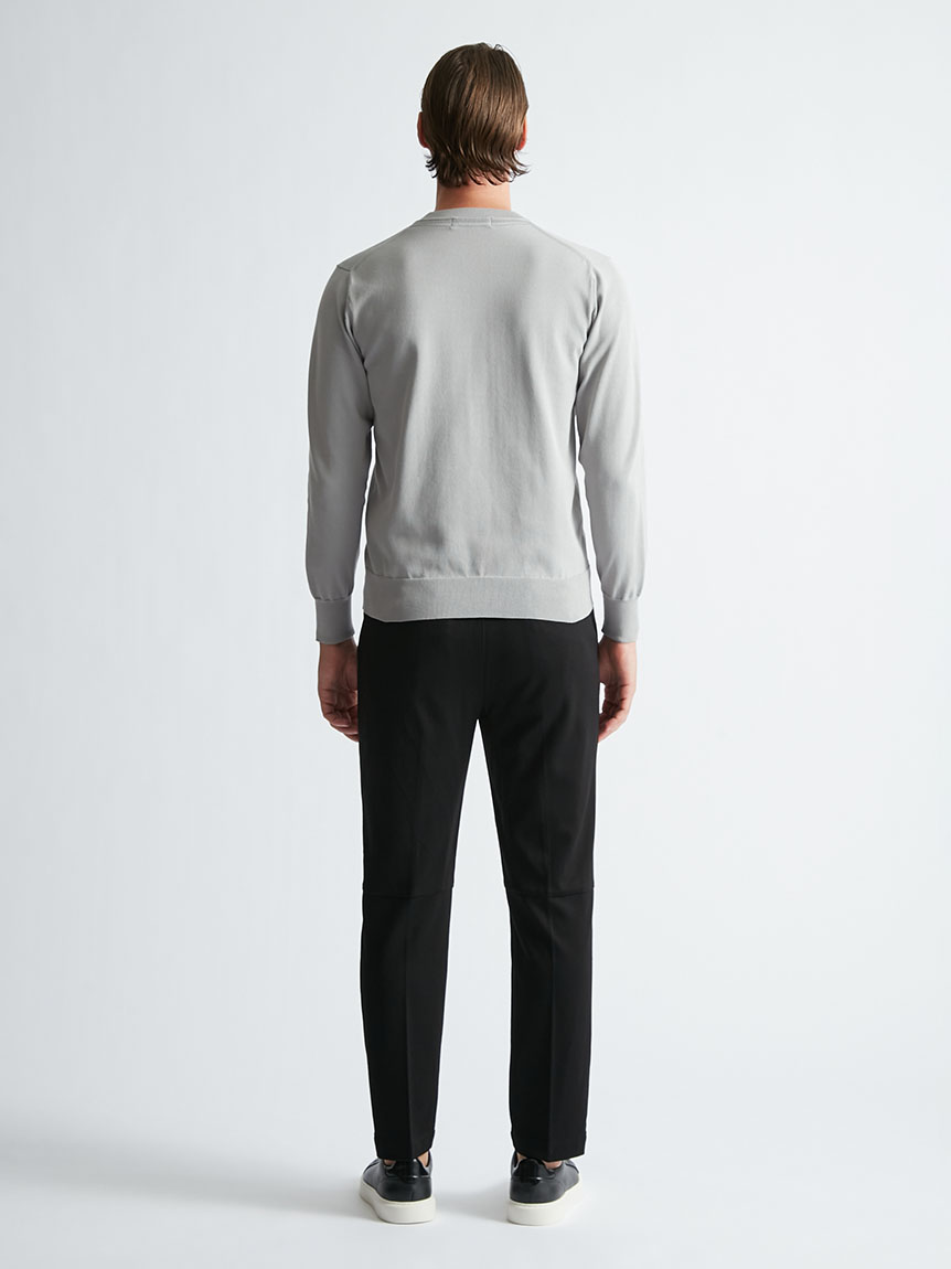 クルーネックは、ネックラインのリブ幅やテンションを繊細に調整し、詰まりすぎず開きすぎないバランスに。