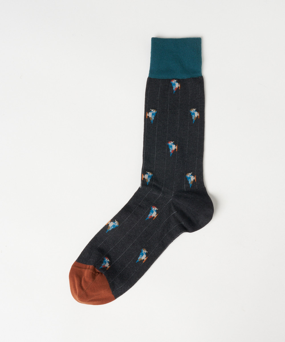 カラフルな鳥のモチーフが目を引くデザイン。鮮やかな色使いでありながらも、全体のトーンを抑えることで派手すぎず、大人のスタイリングにも自然と馴染みます。シンプルなコーディネートのアクセントとして取り入れることで、足元に程よい遊び心と華やかさをプラス。