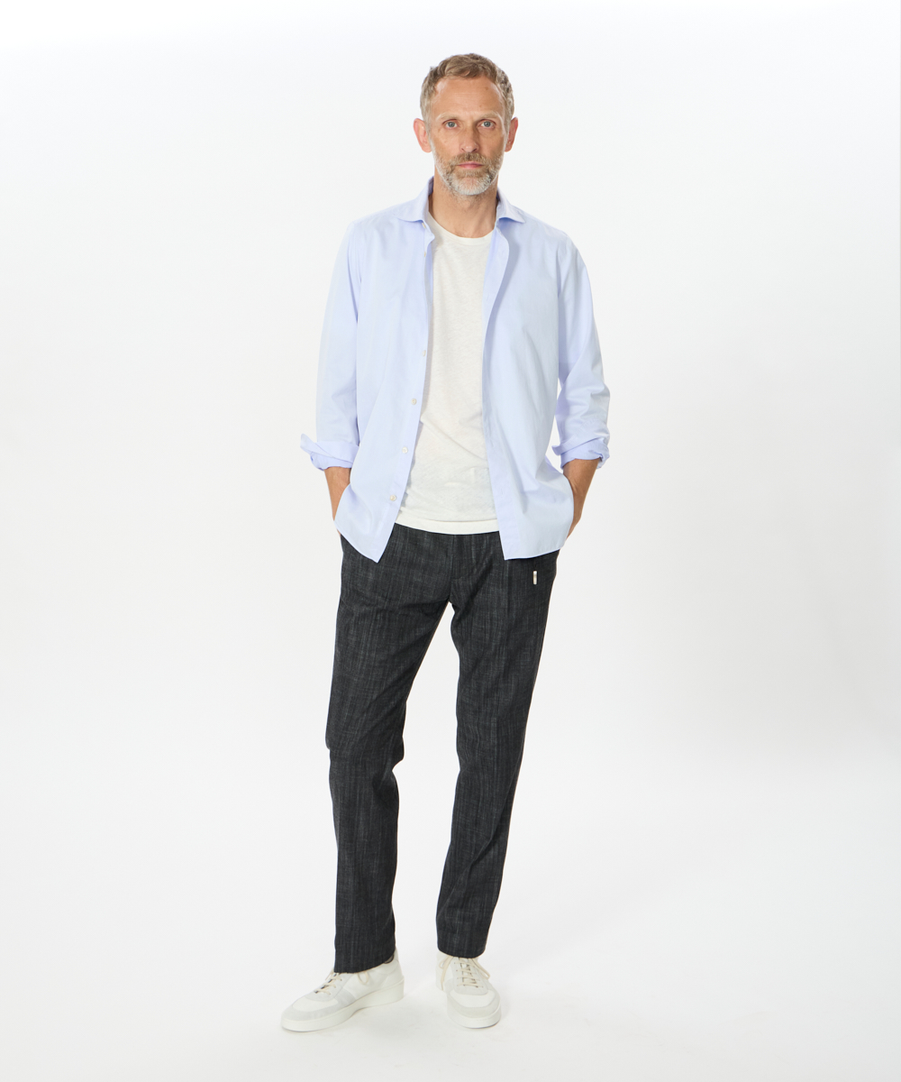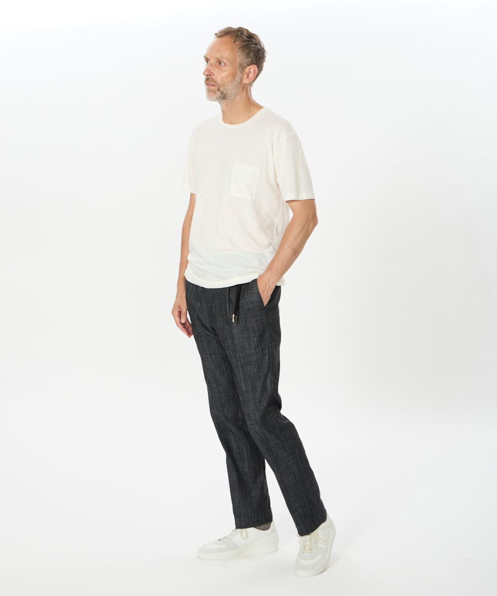 ベルトループ付きの仕様により、カジュアルからドレススタイルまで幅広い着こなしに対応。太もも周りには程よくゆとりを持たせつつ、裾にかけて緩やかなテーパードを効かせた、現代的でスッキリとしたシルエットに仕上げています。