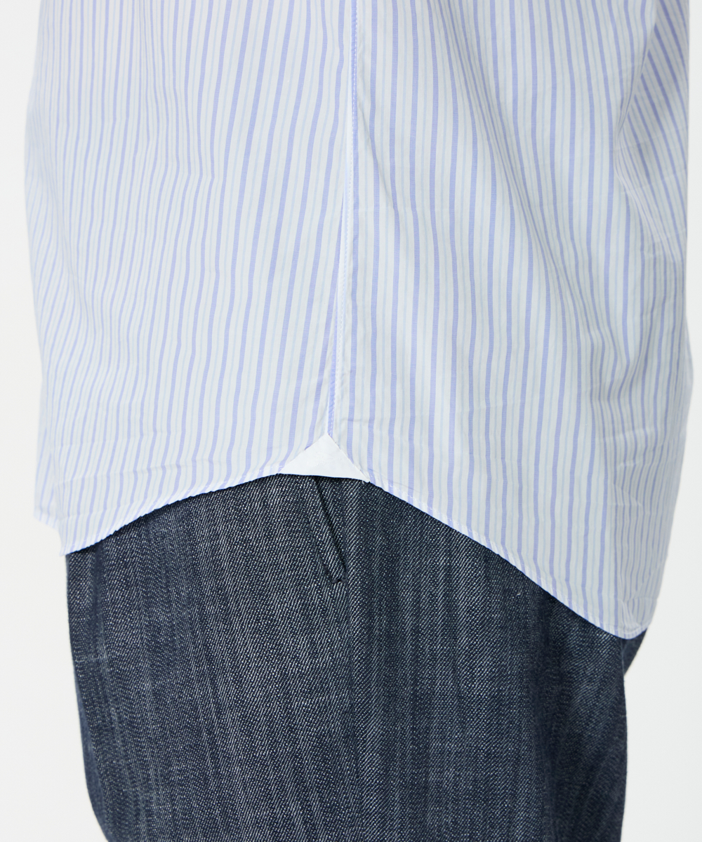 ボディは程よくリラックス感のあるシルエットで、着丈はタックアウト時にもバランス良く着用できるよう、細部まで計算された仕上がり。オンオフ問わず、幅広いスタイリングに対応します。