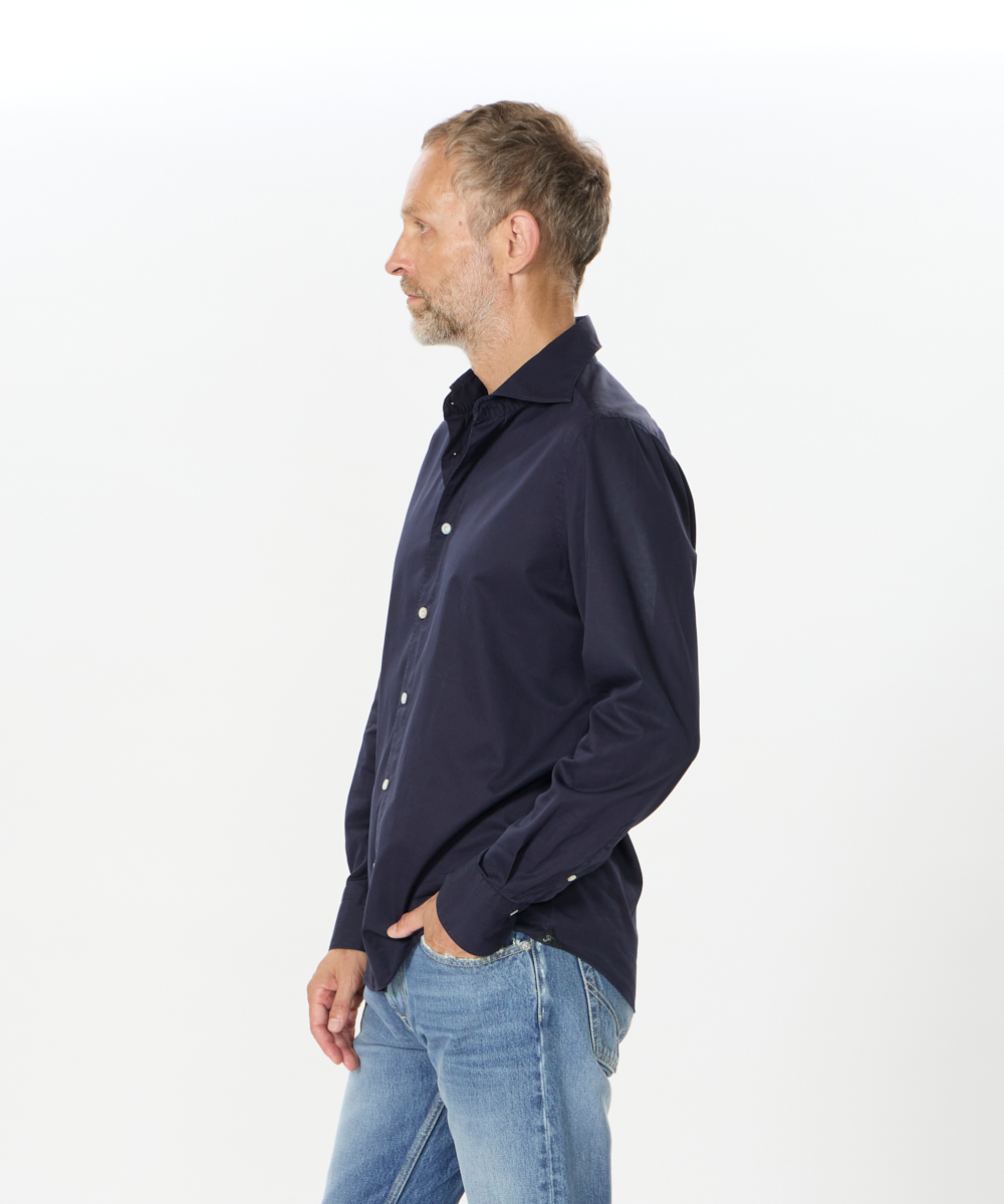 襟型"SIMONE(シモーネ)"は、Finamoreを代表するカッタウェイカラー。襟の開き方が絶妙なバランスで、エレガントな仕上がりです。