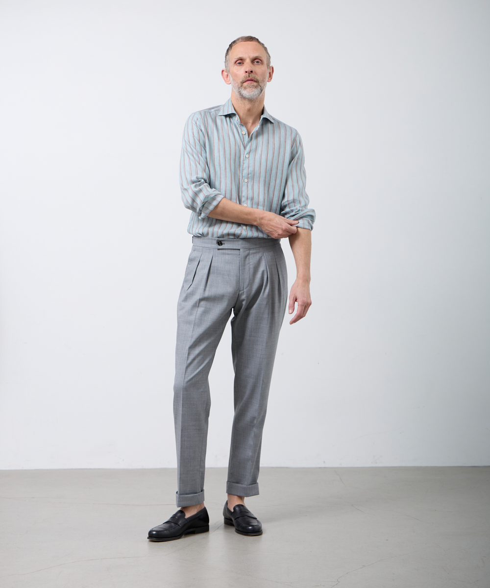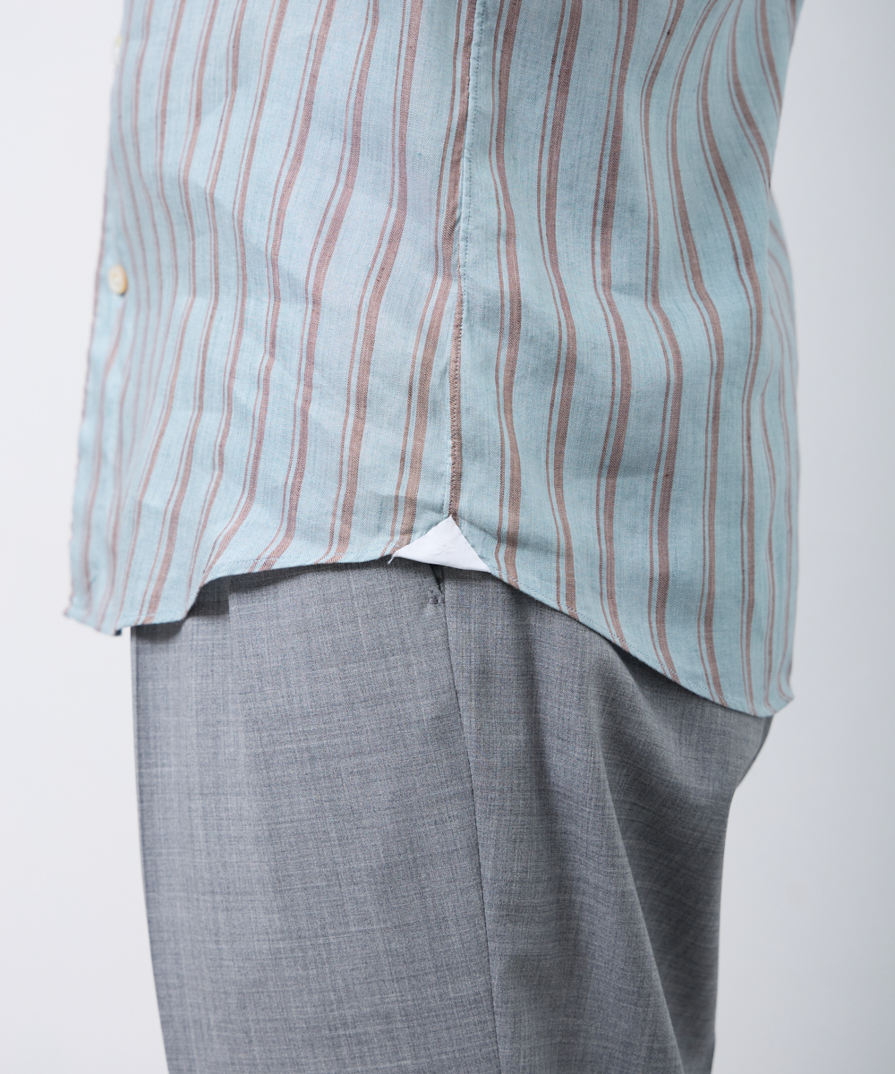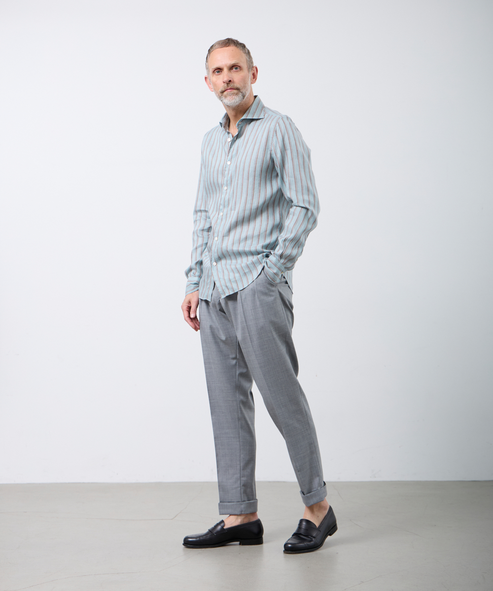 夏には欠かせないリネンファブリックを採用。リネンならではの高い通気性と吸湿性により、熱がこもりにくく、快適な着心地を保ちます。さらに、リネン特有のさりげないシワ感が生み出す表情に、ストライプ柄が縦のラインを強調し、軽やかさの中に程よいメリハリをプラス。無地にはない表情が、シンプルな装いでも奥行きのあるスタイリングを完成させます。