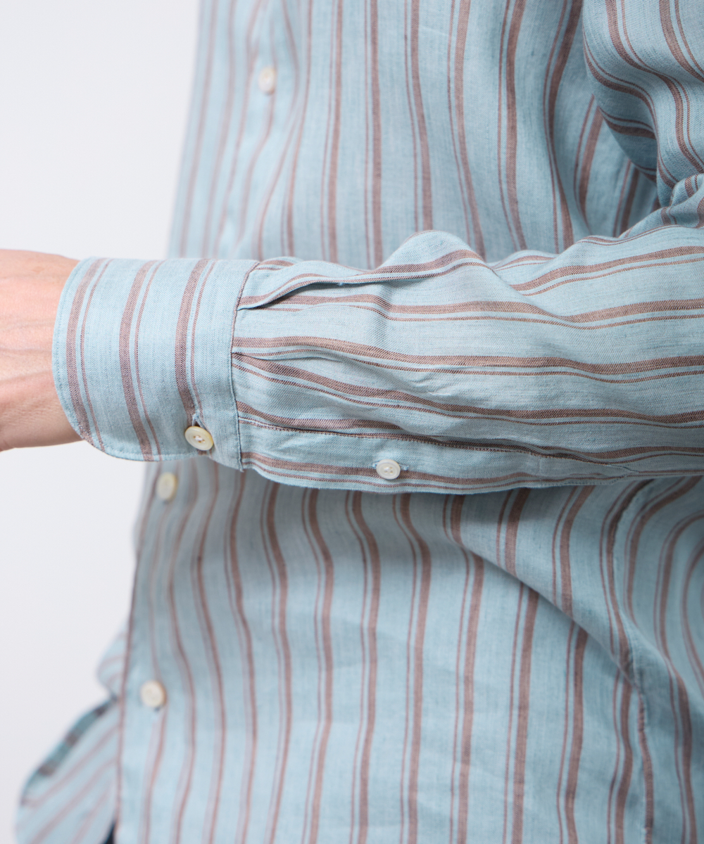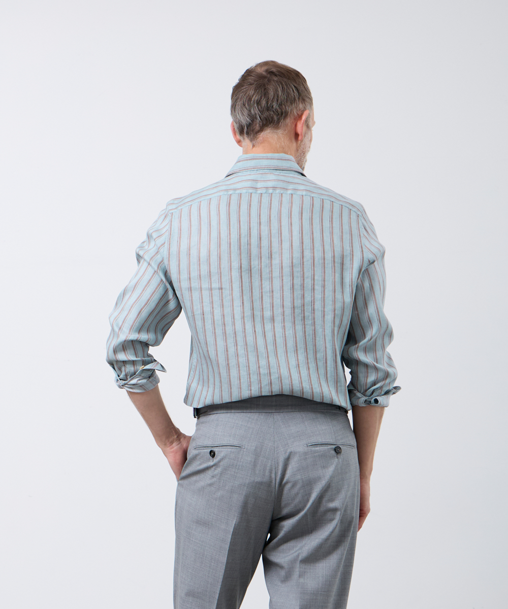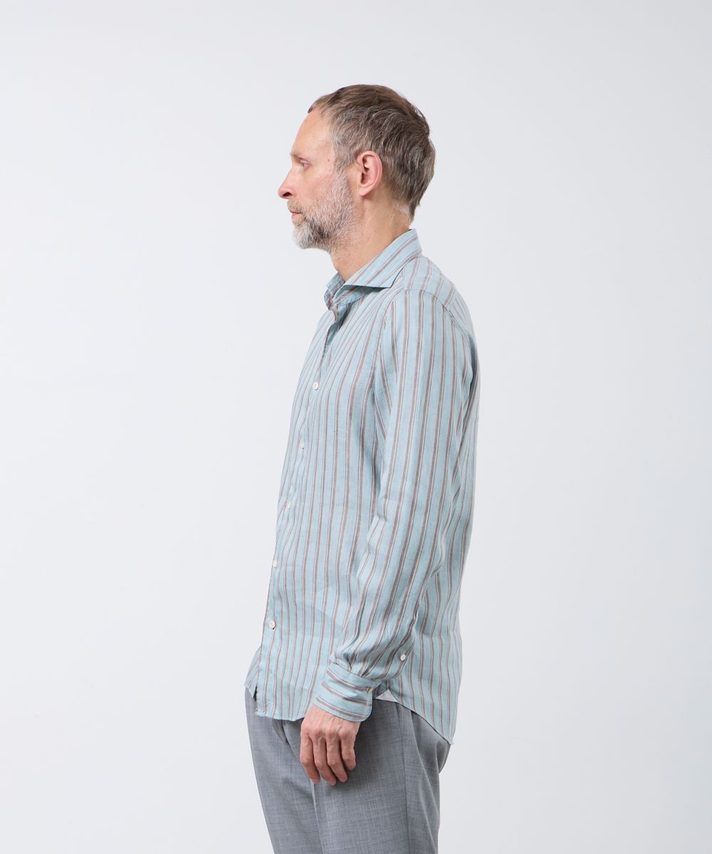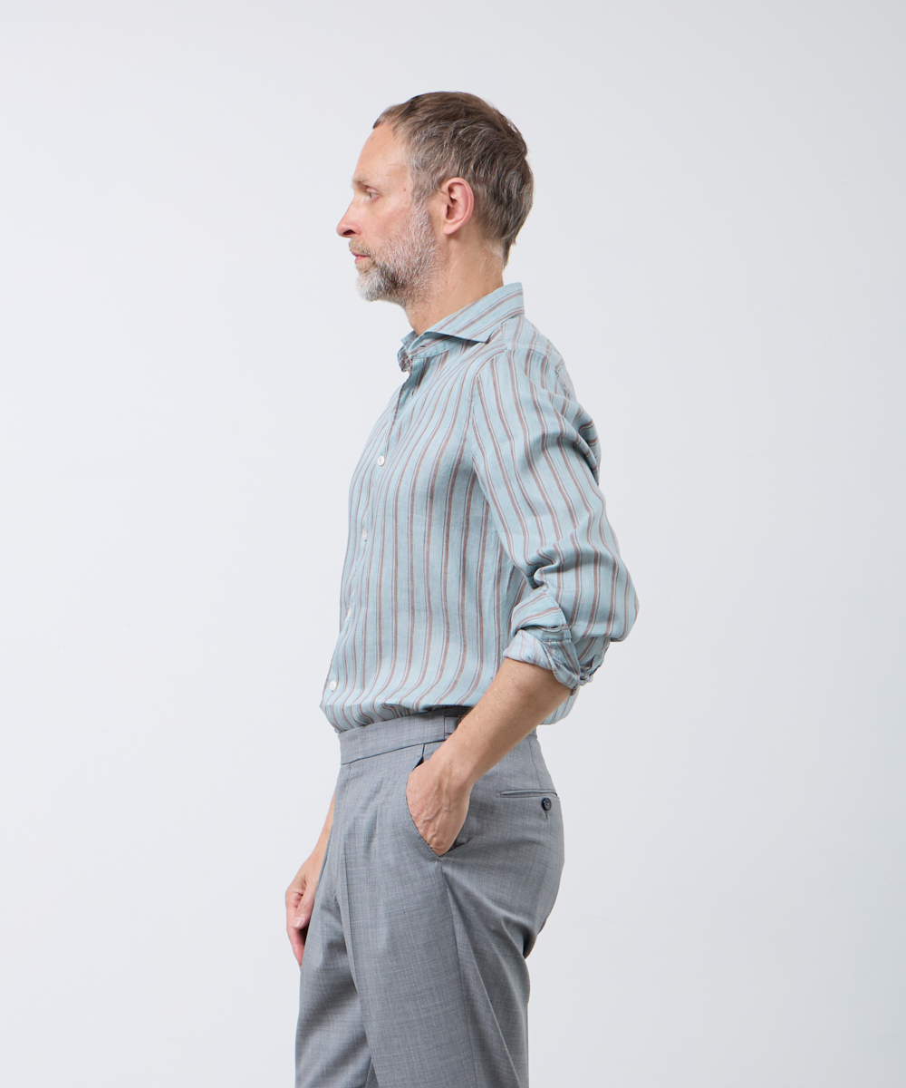 夏には欠かせないリネンファブリックを採用。リネンならではの高い通気性と吸湿性により、熱がこもりにくく、快適な着心地を保ちます。さらに、リネン特有のさりげないシワ感が生み出す表情に、ストライプ柄が縦のラインを強調し、軽やかさの中に程よいメリハリをプラス。無地にはない表情が、シンプルな装いでも奥行きのあるスタイリングを完成させます。