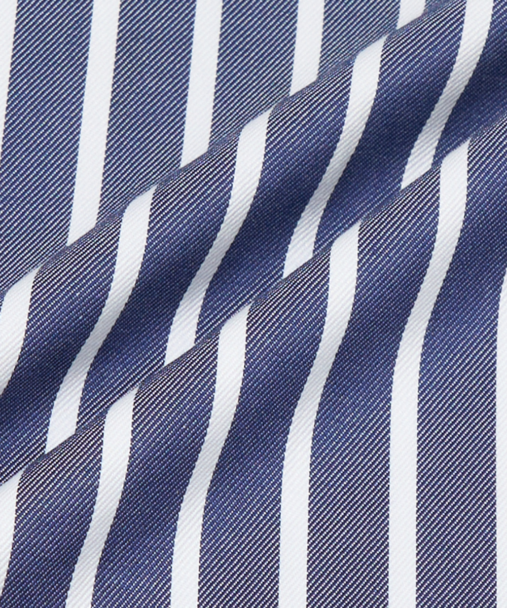 コットン100%のファブリックを採用。ネイビー地にホワイトストライプを配した、ありそうでなかなかないデザインです。ビジネスライクな細かなピッチではなく、あえて存在感のあるストライプ柄にすることで、シンプルなスタイリングに自然なアクセントを加えます。ストライプが生み出す縦のラインは、シルエットをすっきりと見せ、軽やかさの中に程よいメリハリをプラス。無地にはない奥行きのある表情は、一枚で着ても、レイヤードしても映える仕上がりです。