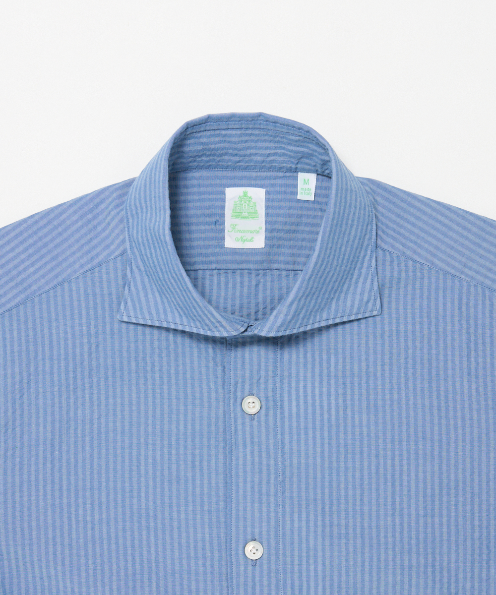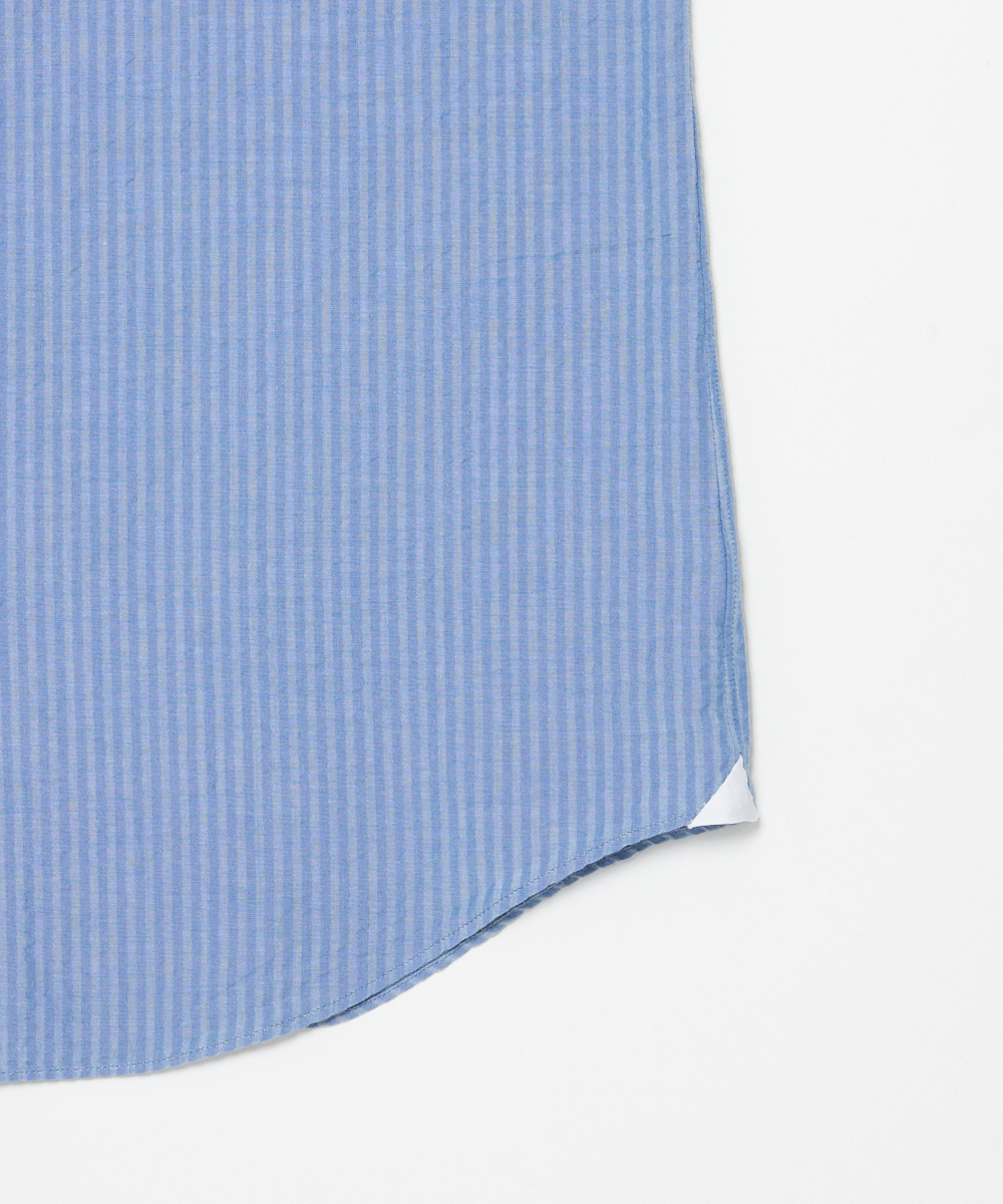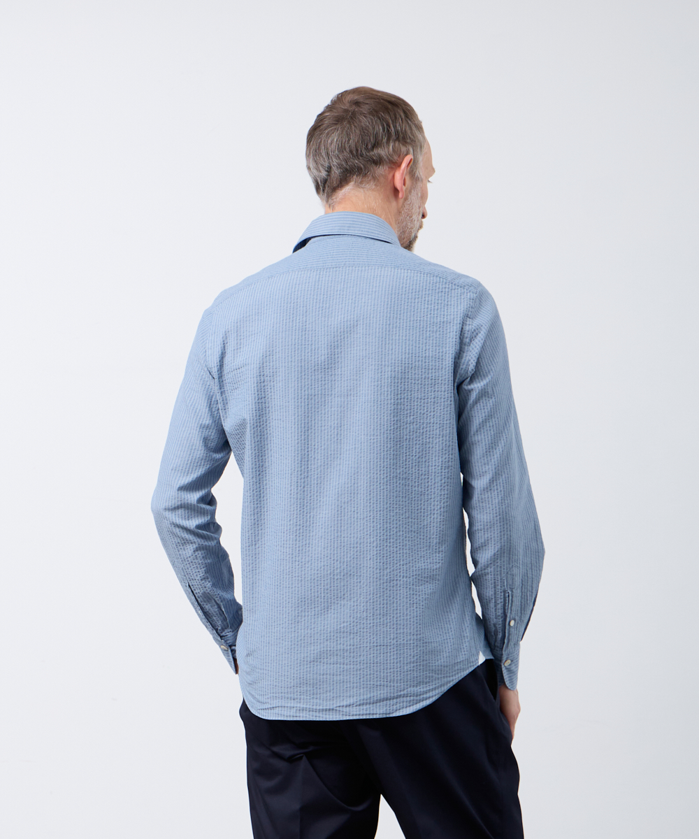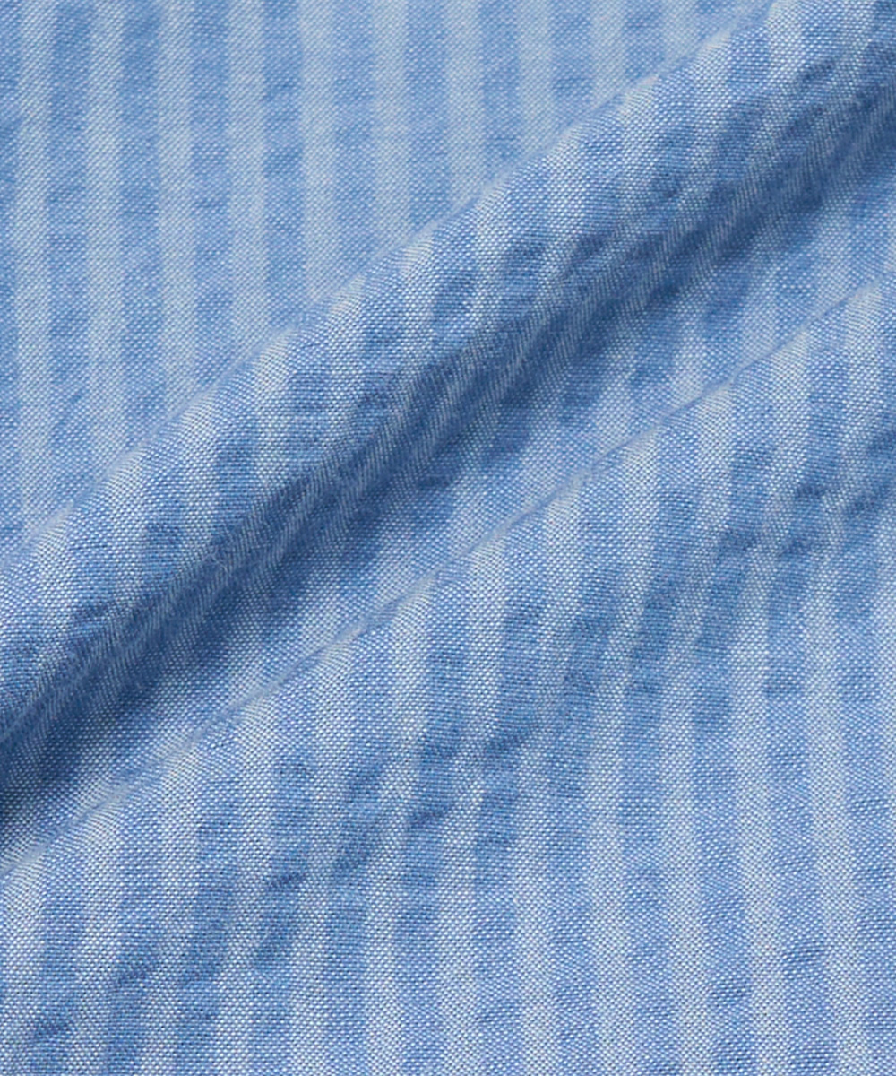 ひときわ清涼感のあるシアサッカー素材を使用した一着。サラリとした肌触りで、ベタつきにくく、さらにシワになりにくいのも魅力です。ブルーを基調にしたストライプは、上品な印象を保ちつつ、縦のラインがシルエットをすっきり見せます。大人のビジネスカジュアルやクールビズスタイルに合わせれば、清潔感と軽やかさを演出。一方で、ジャケットを外してラフに着こなすことで、休日のリラックススタイルにも自然になじむ汎用性の高さも魅力です。夏の装いに欠かせない、快適さと品格を兼ね備えた一着と言えるでしょう。
