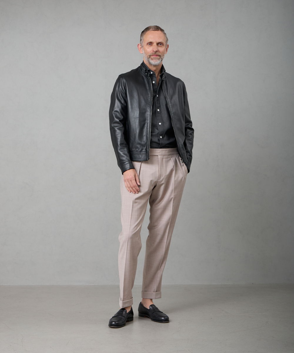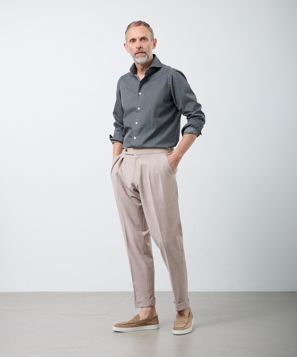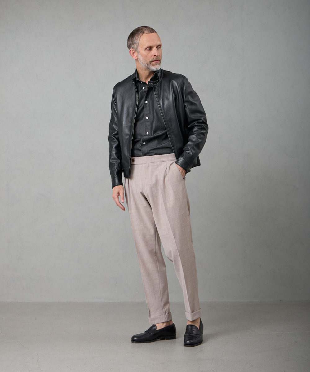 サイドアジャスター付きのクラシカルな仕様が魅力。腰回りはゆったりとしたシルエットながら、裾に向かって美しくテーパードがかかっており、さらに2プリーツを施すことで、ほどよく引き締まり、クラシックながらモダンな印象を演出します。