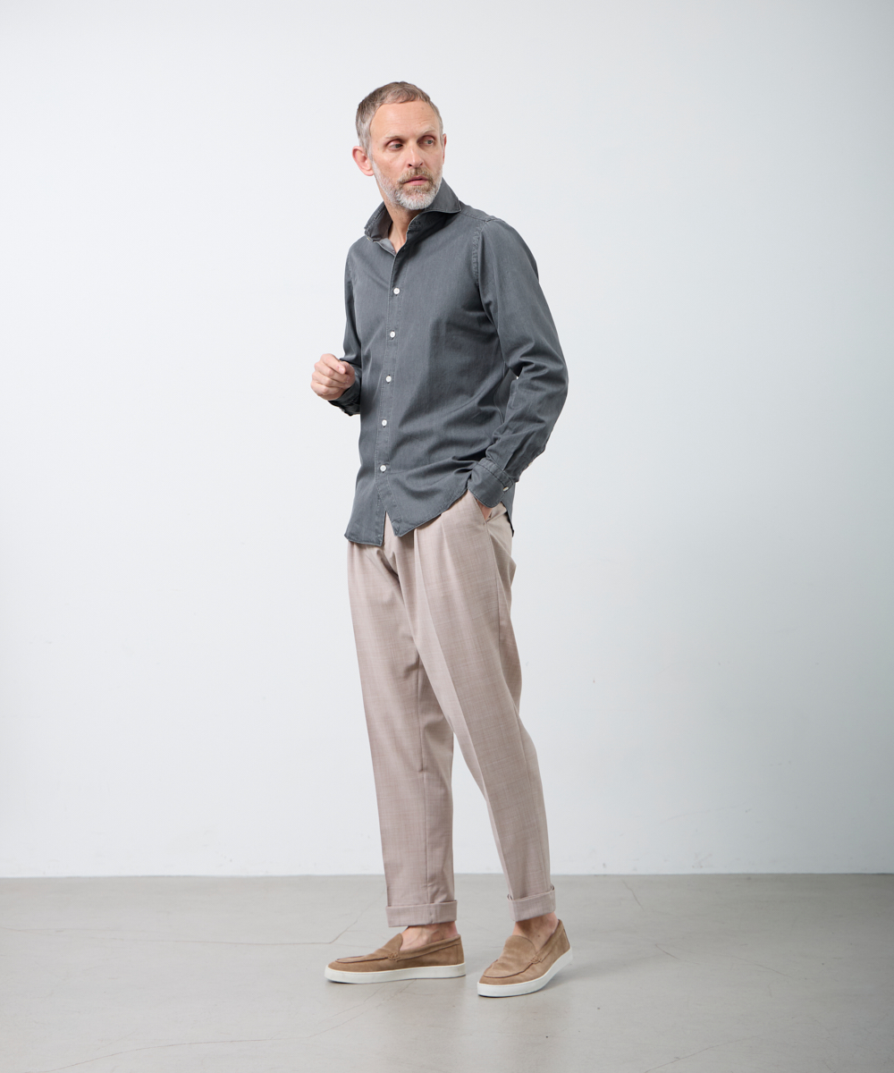 ウール52%、ポリエステル43%の混合生地を使用し、適度な肉感とさらりとした肌触りを兼ね備えた一本。通気性にも優れており、蒸し暑い春夏シーズンにも快適に着用いただけます。生地の魅力を引き立てるグレーとベージュの定番カラーを採用し、クラシックだけど重く見えない、上品な春夏スラックスに仕上げました。ビジネスカジュアルから休日の軽めコーデまで対応。ジャケットやシャツ、カットソーとも相性がよく、春夏の軽やかなスタイルの土台として活躍します。履くだけで整う、軽やかで上品なす一本を、ぜひ、お楽しみください。
