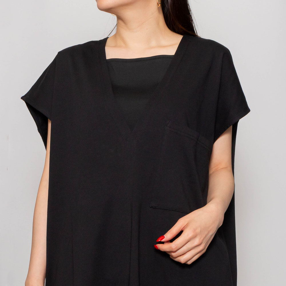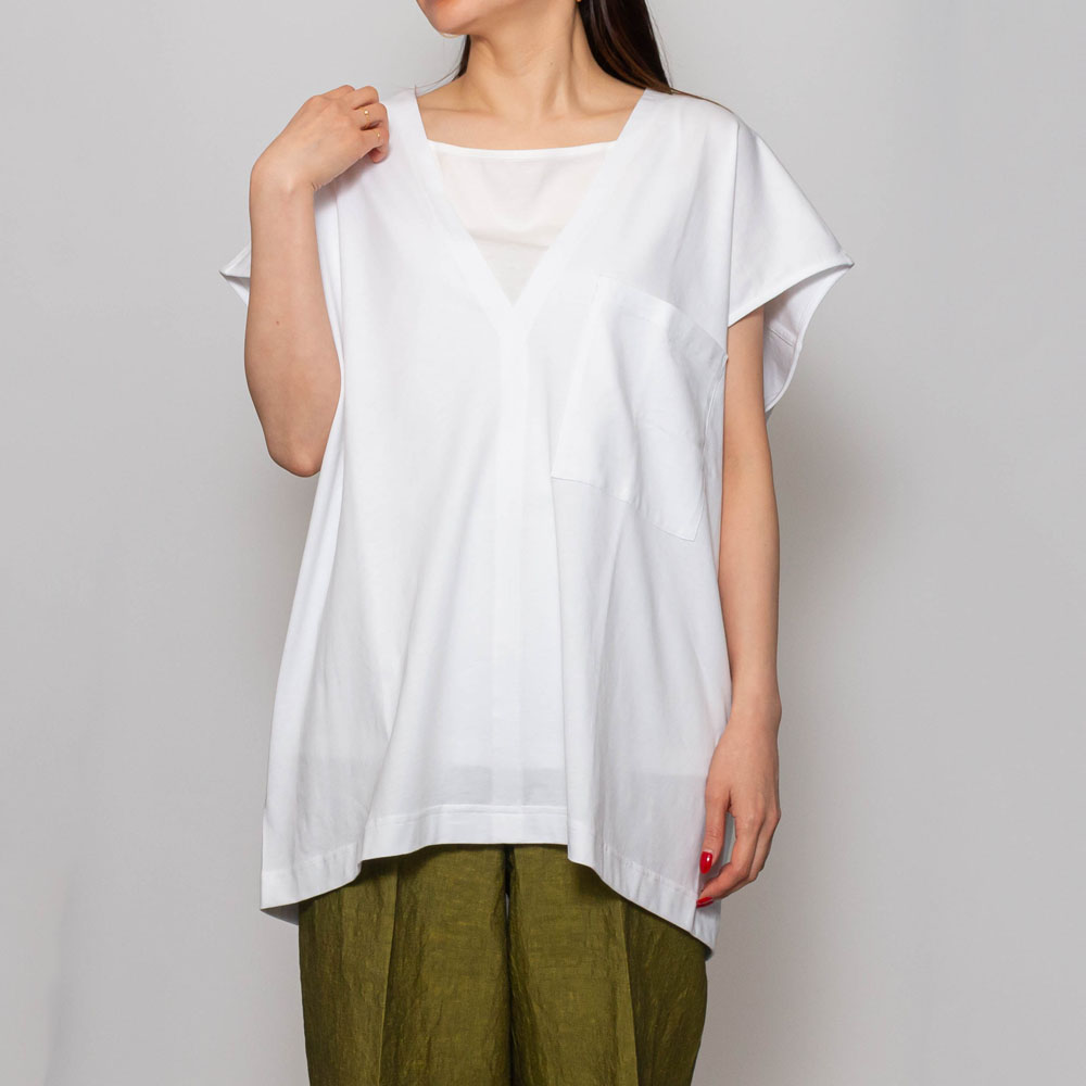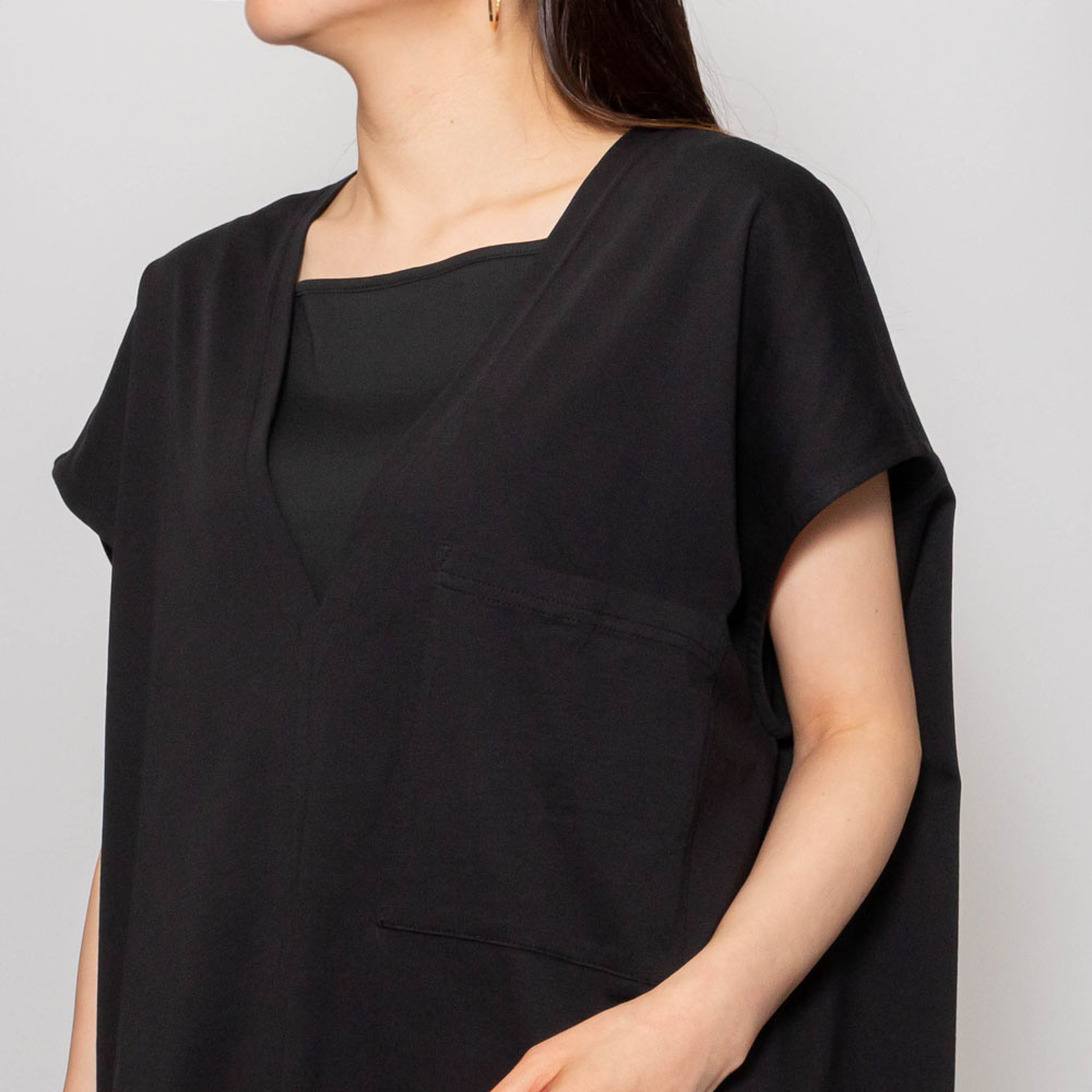 デコルテが覗く深めのVネックと左胸に大きめのポケットを配したエッジのきいたデザインで、モダンな雰囲気をまとった1着に仕上がりました。
