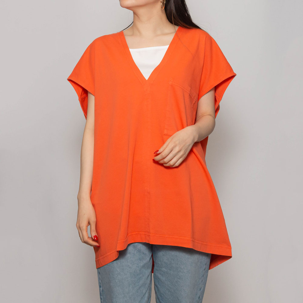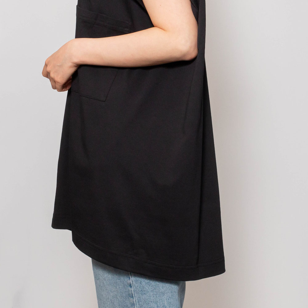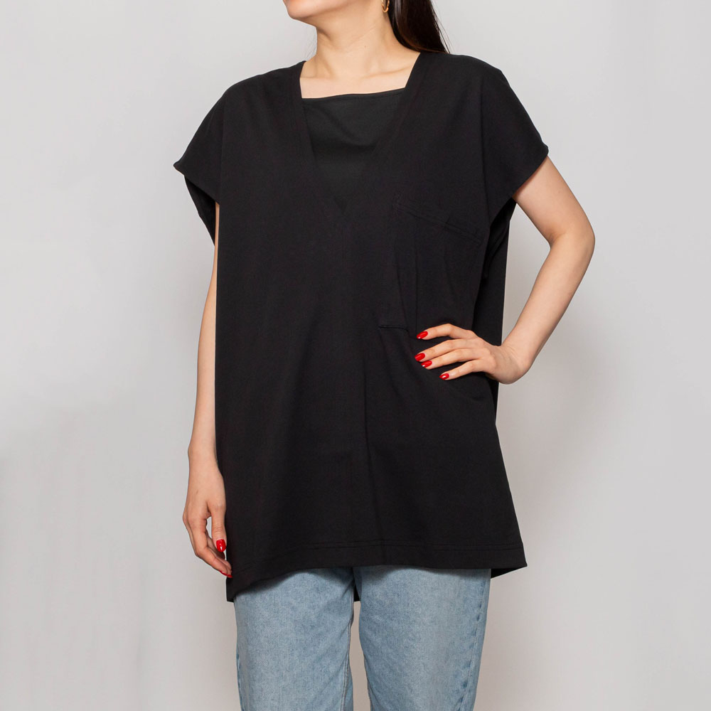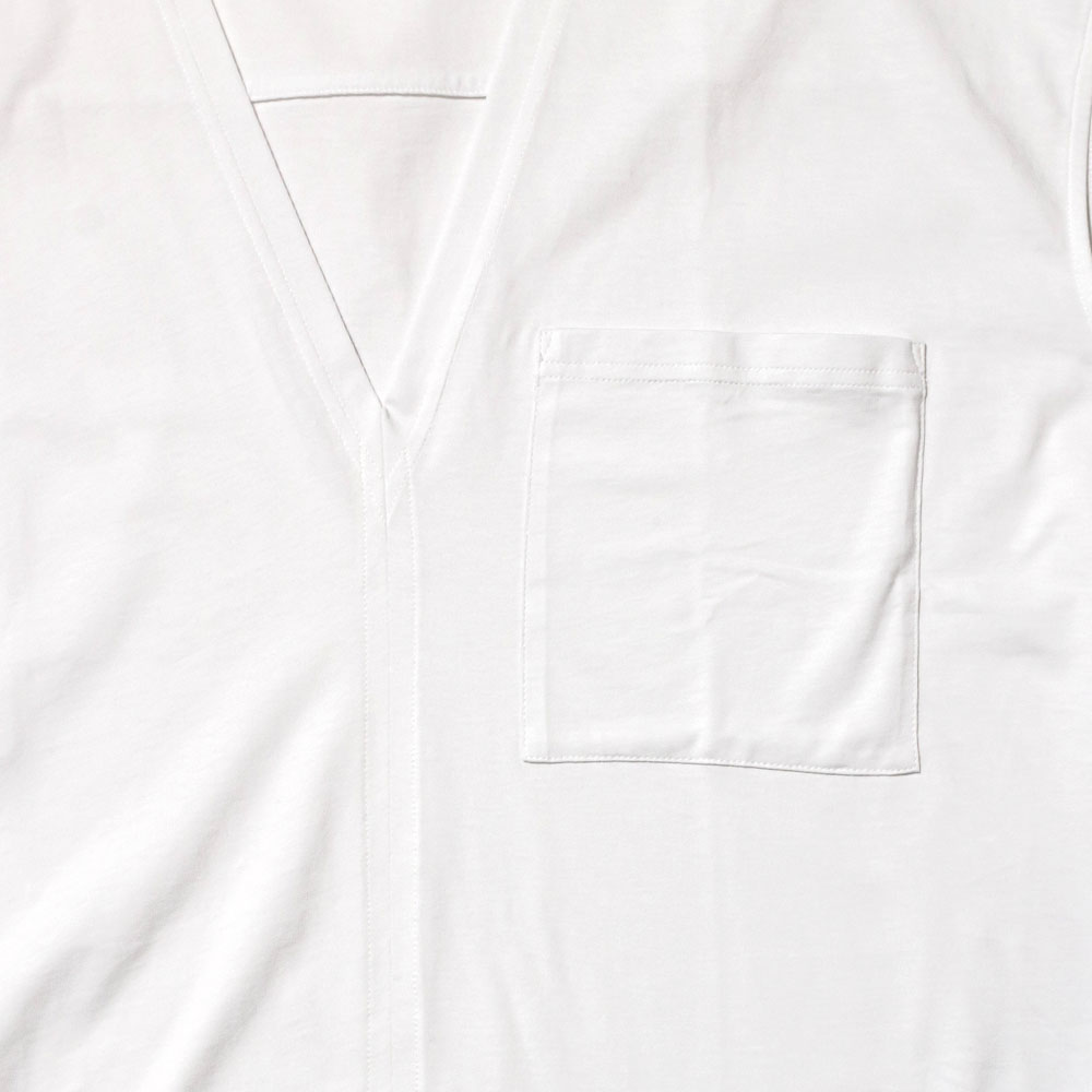デコルテが覗く深めのVネックと左胸に大きめのポケットを配したエッジのきいたデザインで、モダンな雰囲気をまとった1着に仕上がりました。