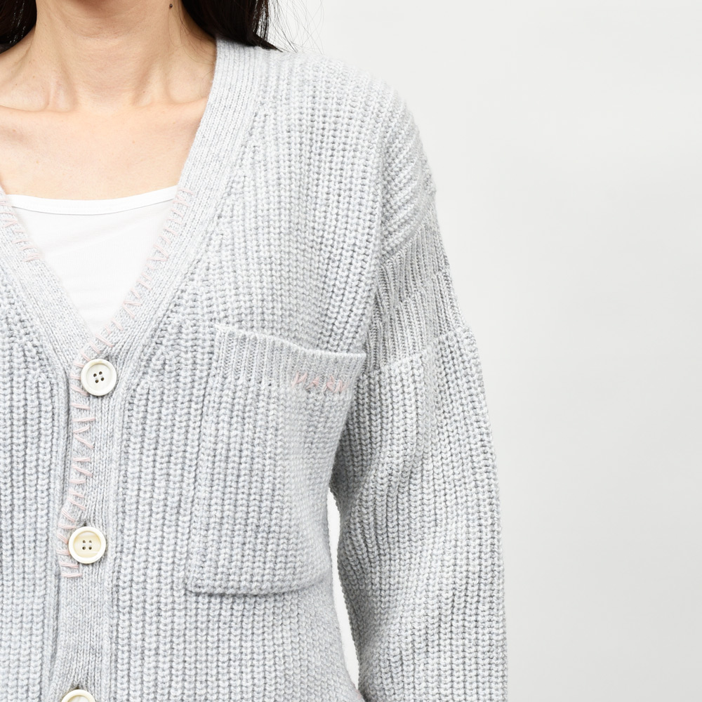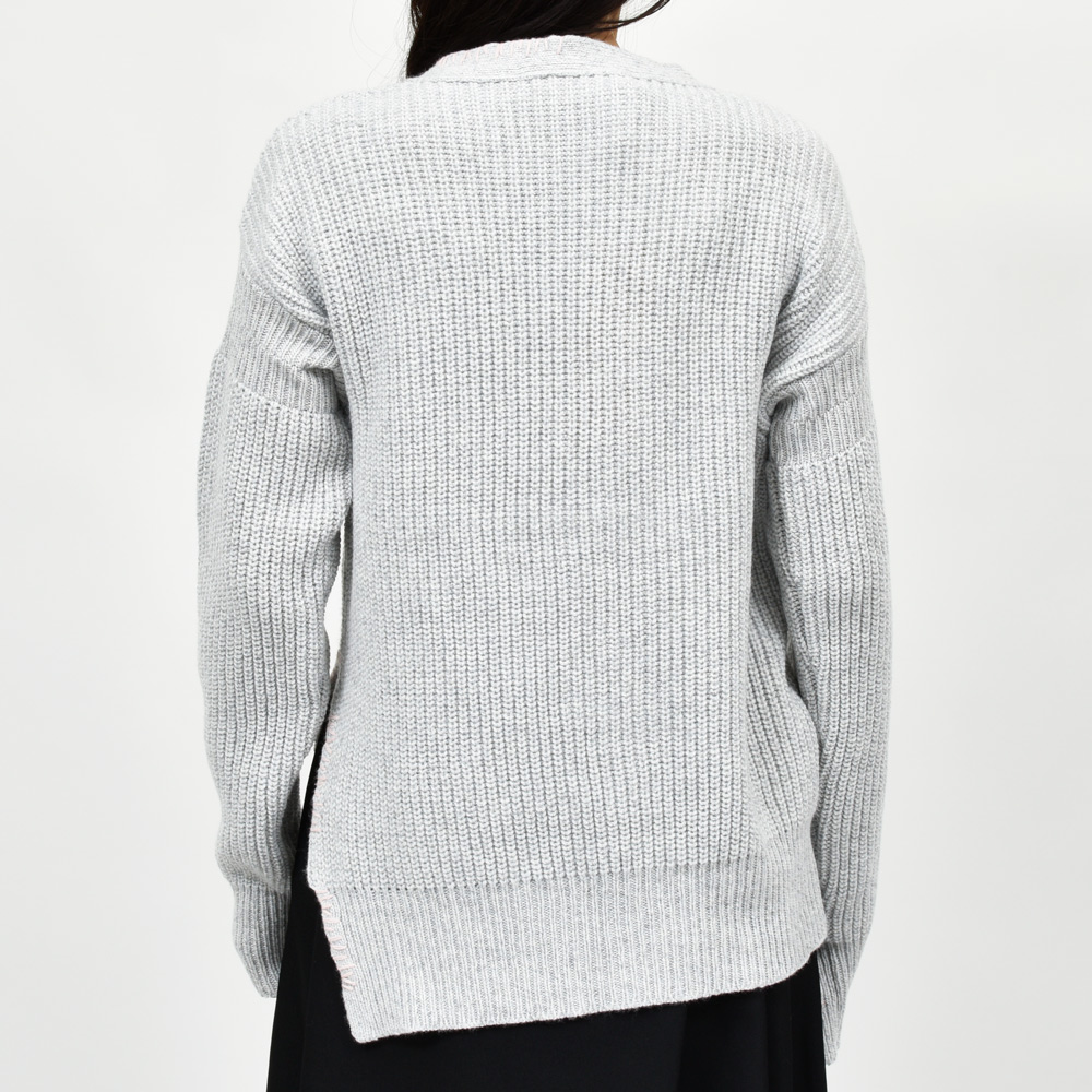 アシンメトリーなディティールが際立つVネックカーディガン。