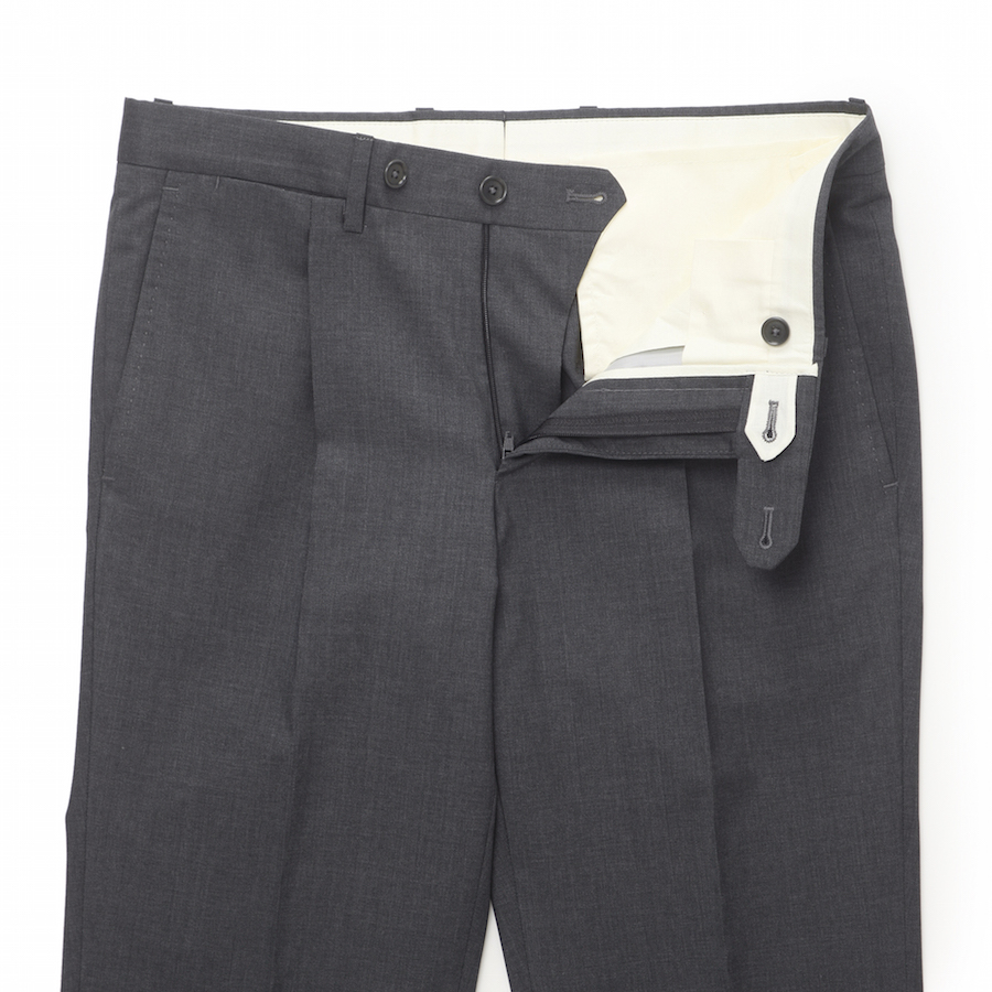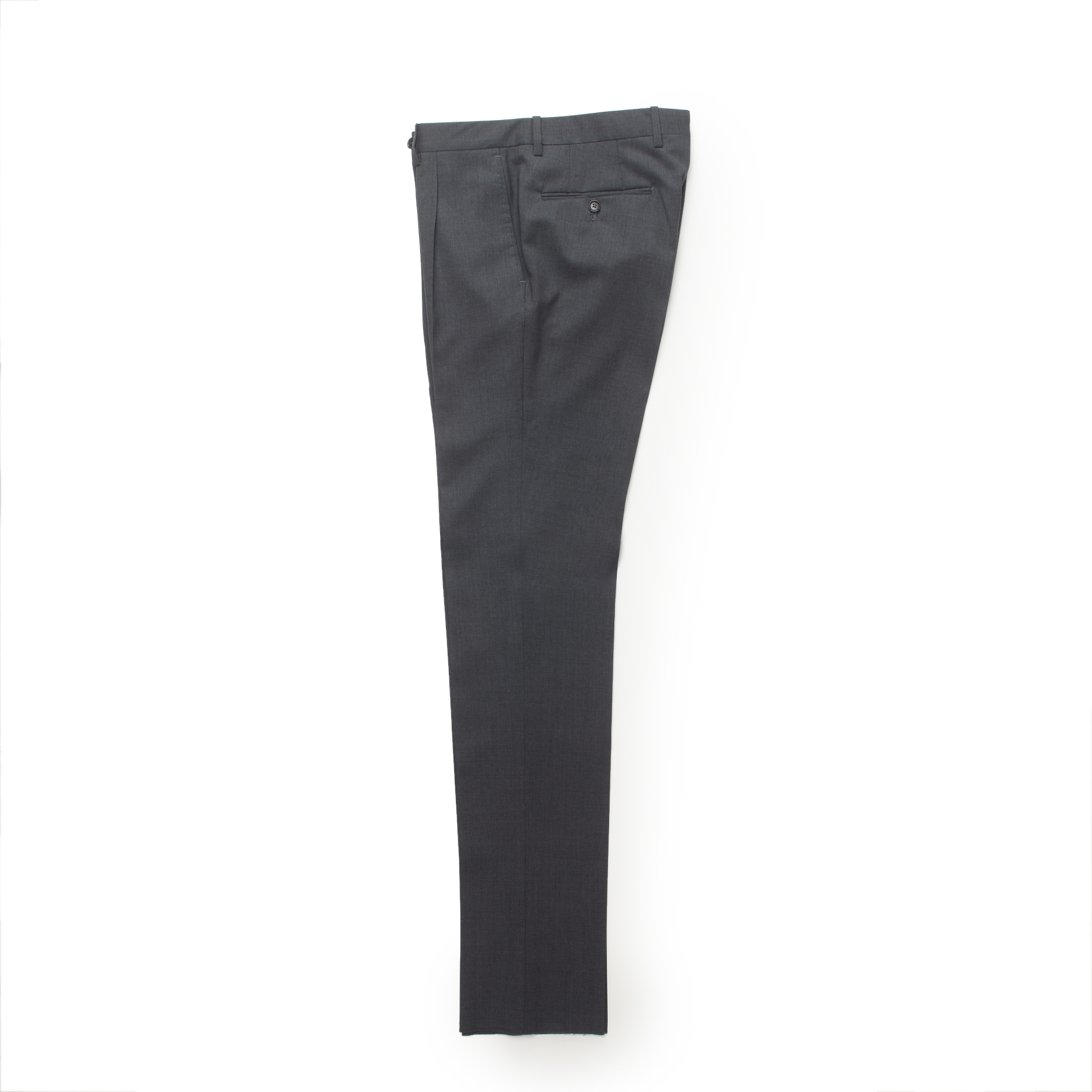 ・パンツはスリム1プリーツモデルをセレクト。「De Petrillo(デ ペトリロ)」の中で最も細いノープリーツモデルB/Sより腰周りにややゆとりはありますが、ワタリや裾幅はスリムでテーパード感の強いモダンなシルエットです。