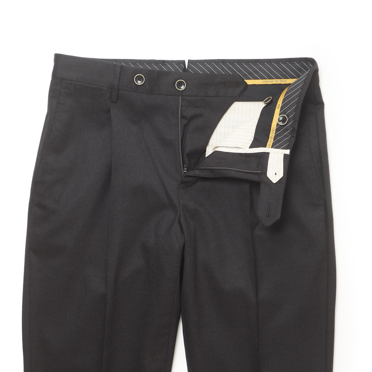 ・その"GENTLEMAN FIT"のアイコンとも言えるのはフロントに付けられたフラップ付きコインポケット。そのクラシカルな雰囲気を醸すディテールを削ぎ落としたのがBRの別注です。コインポケットはそのままに、従来付けられていたフラップとフラップを留めるためのボタンを外すことでシンプルな見た目を実現。シャツなどをタックインした際には、主にビジネスシーンでその威力を発揮します。