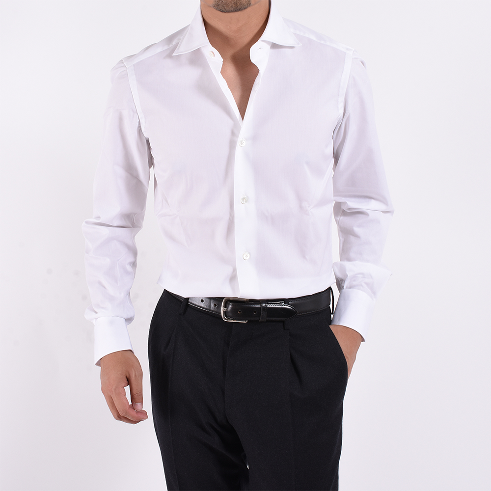 ・豊富なバリエーションを誇る「AVINO(アヴィーノ)」の襟型の中から、襟の大きさ、開きの角度などを吟味し、現代的に見えるワイドカラー"C30"をセレクト。また、ソフトな芯地、ラウンドのカフス、ボタンの形状をB.R.SHOPが指定してオーダーしています。