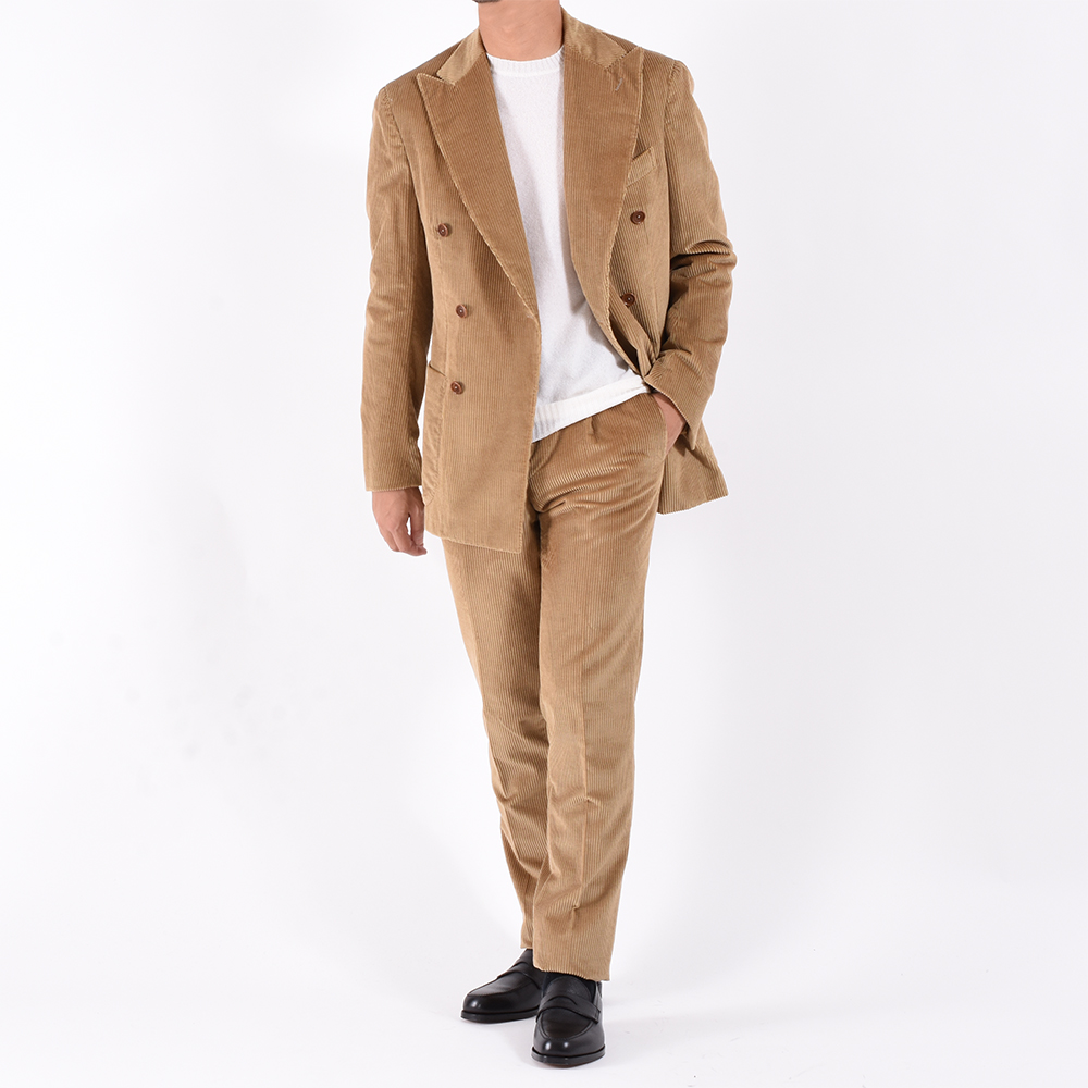 コーデュロイのダブルのスーツでありながら、パッチポケット仕様なのでスーツでの着用はもちろん、ジャケット単品での使用もでき、汎用性は抜群であるこちらの1着。タイドアップはもちろん、インナーにニットを着用し足元はスニーカーを合わせたラグカジスタイルも◎今期コーデュロイのスーツをお持ちであると、非常に使えるでしょう。
