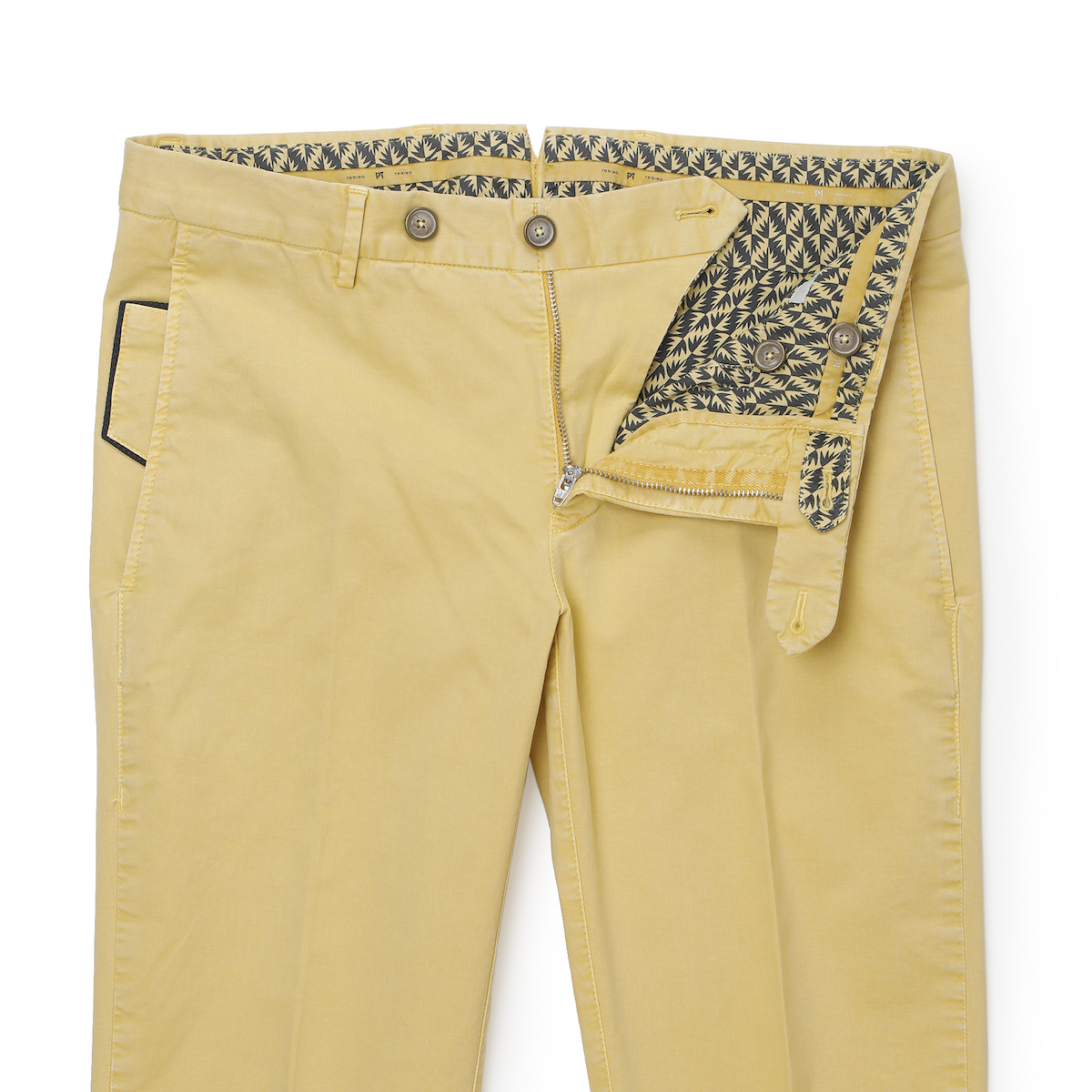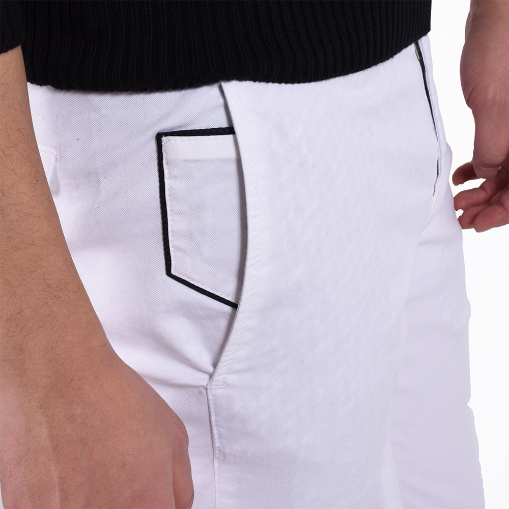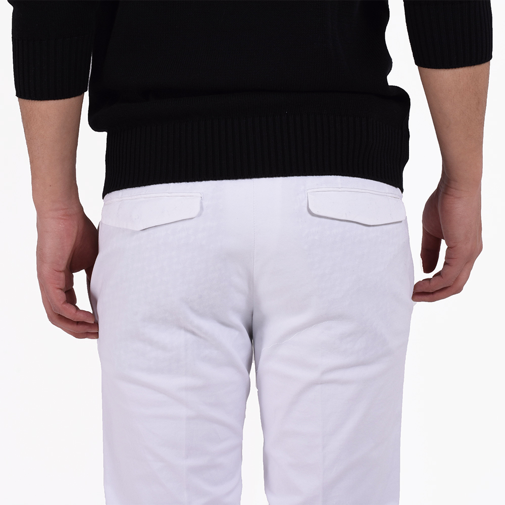 今シーズンも登場しました!もう、お馴染みのPT01!ではなく、リブランディングを果たし、ブランド名を変更した「PT TORINO」です!こちらは代表的モデル“SKINNY FIT”のコットンパンツ。コットンでもギャバジン素材を使用しているので、ほんのり光沢感としなやかさがあるのが特徴です。そして、ストレッチ性もしっかりあるので、屈伸ができる程楽です。細身体型で普段はサイズ42を着用していますが、こちらのモデルはワンサイズ上げたサイズ44がピッタリでした。サイズ42だと脚に生地が張り付く感じですが、サイズ44は適度なゆとりがありつつシルエットもしっかりキープ。股上が少し浅めなので腰骨の真ん中辺りにウエスト位置がきます。普段選ばれているサイズよりひとつ上のサイズでもよろしいかなと思います。