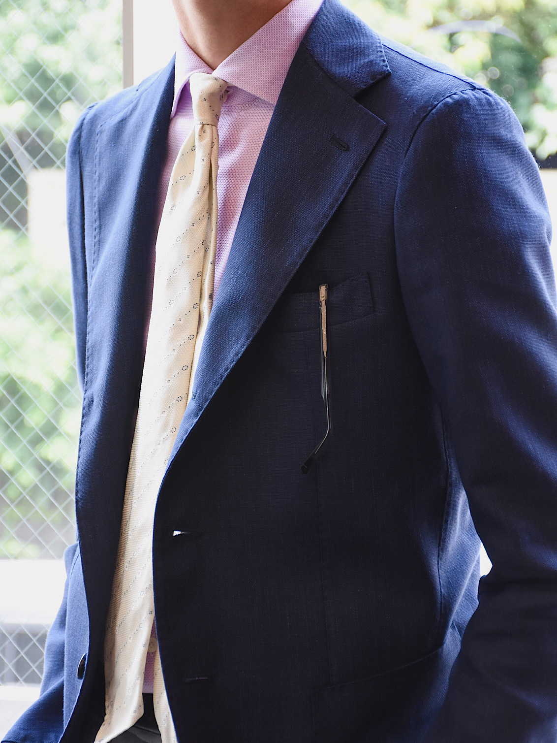ナチュラルショルダーらしい綺麗な肩のラインはもちろん、マニカカミーチャの袖付けなどは、ナポリのジャケットらしい仕立てに仕上がっております。