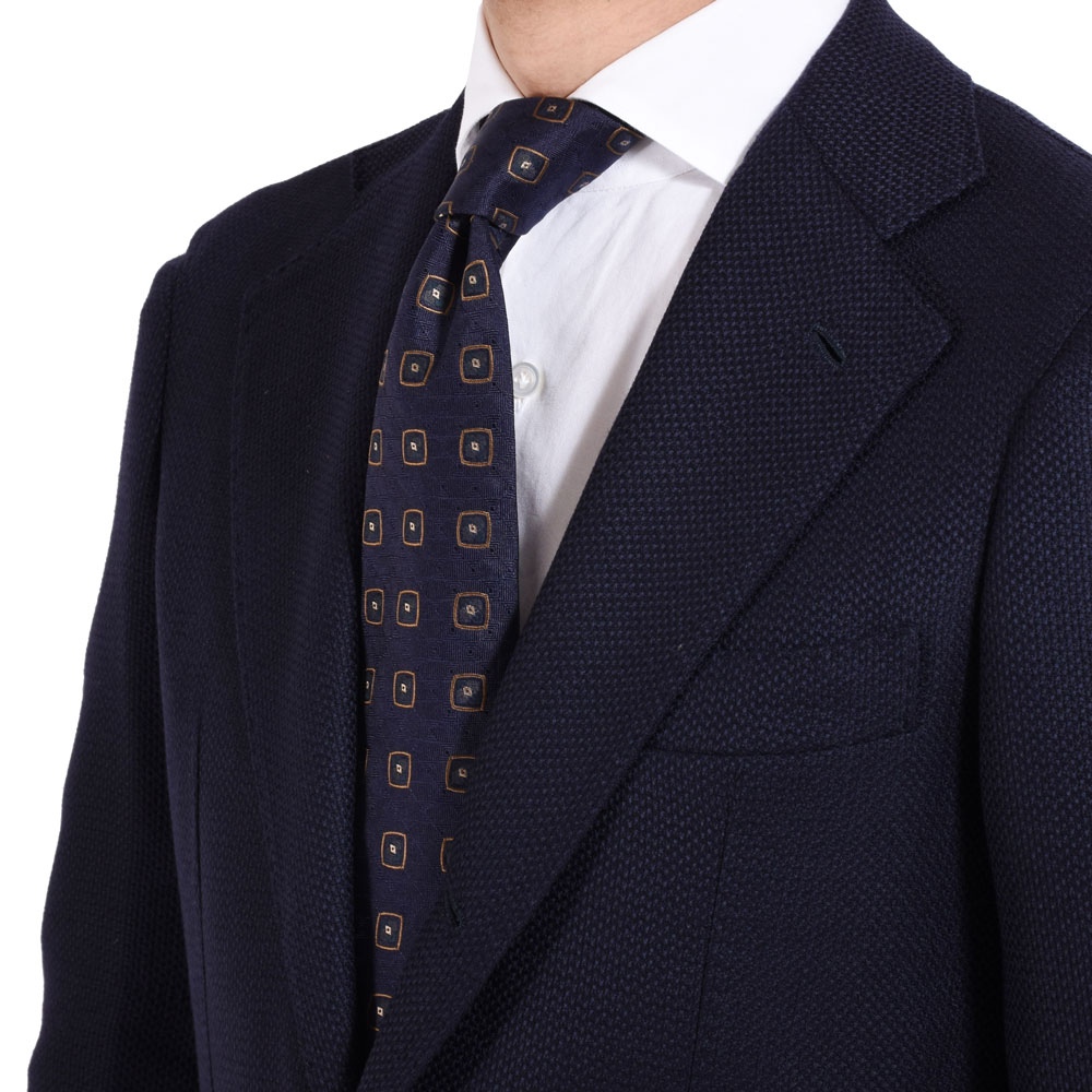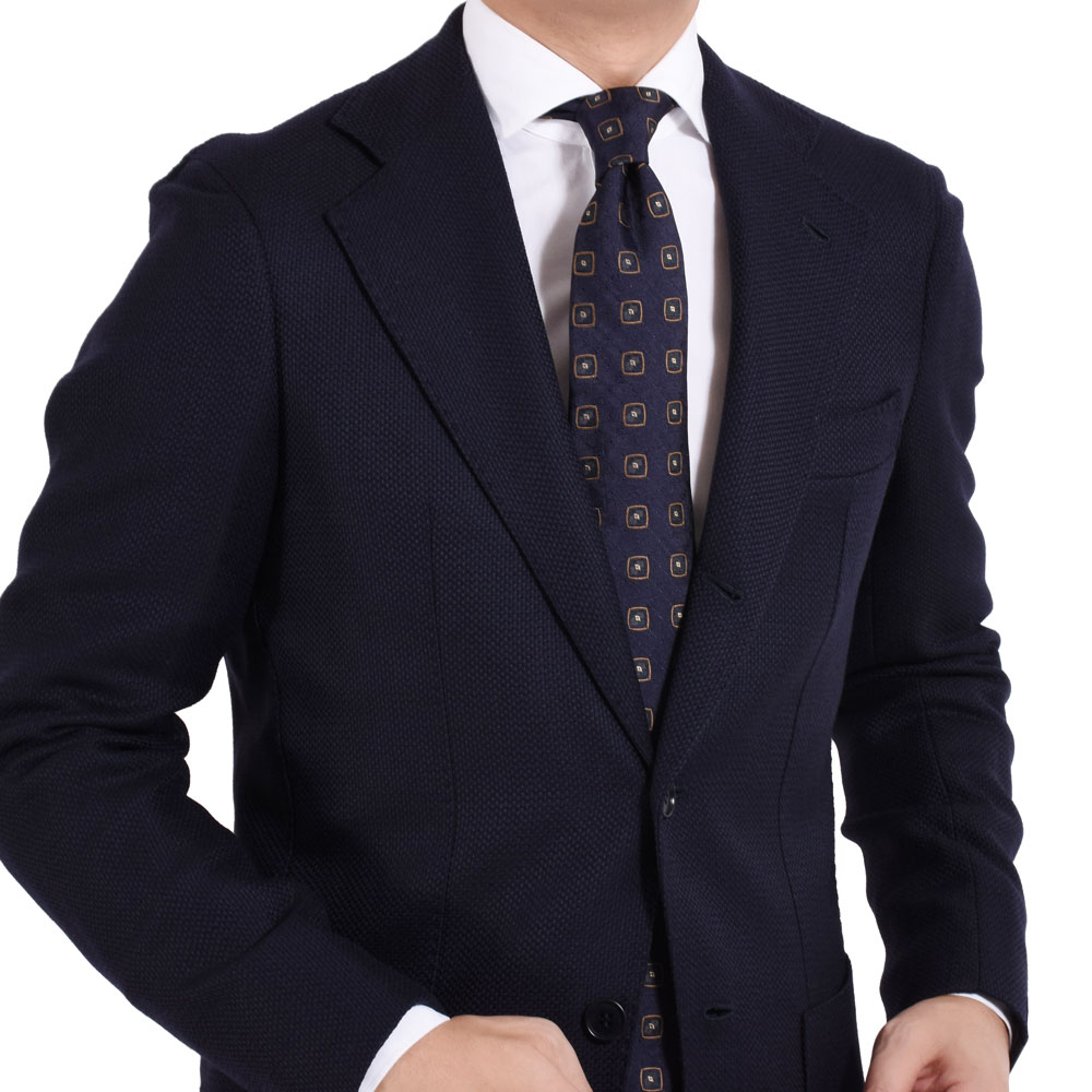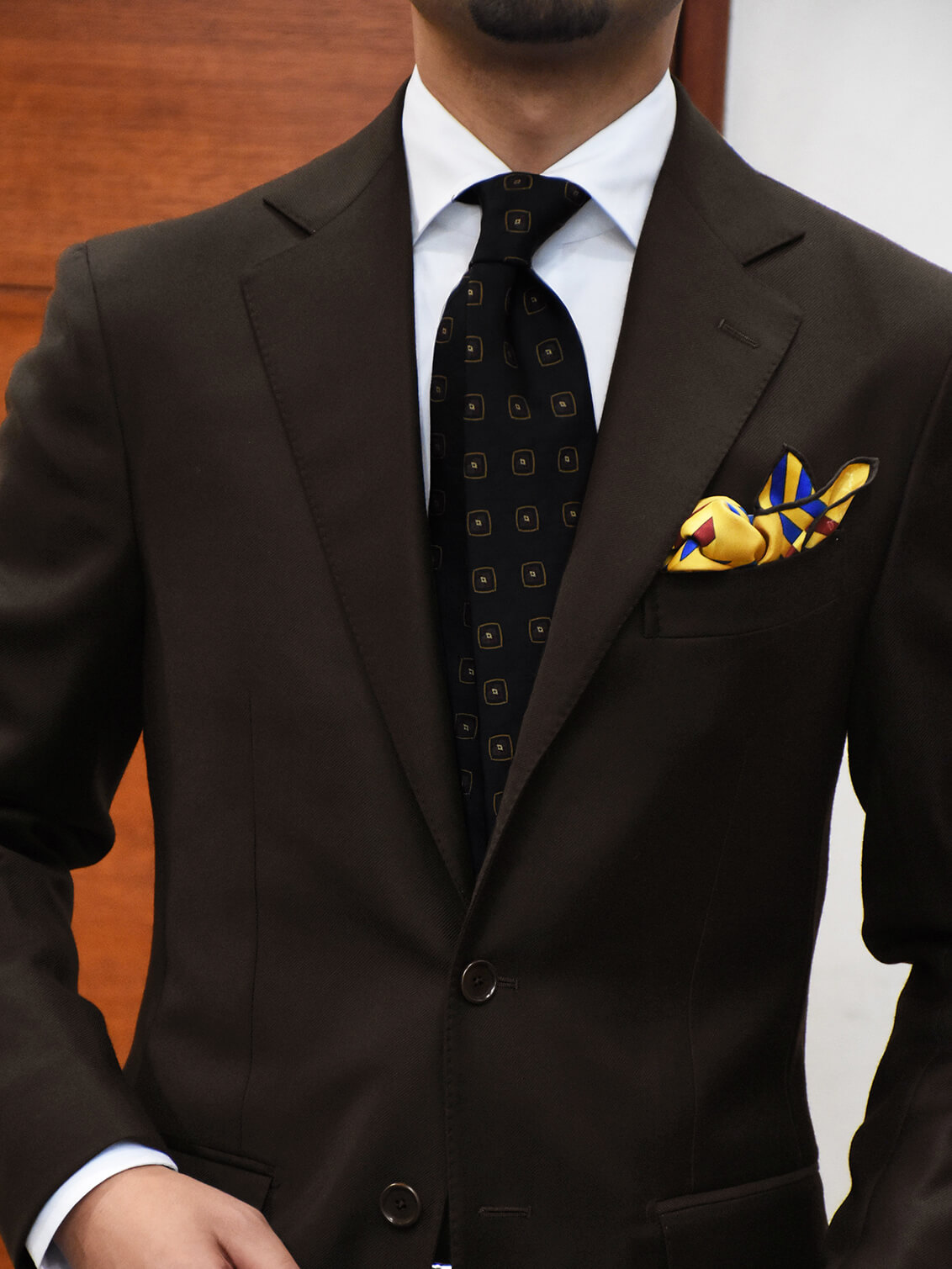 細かな柄なので、無地のジャケットやスーツと合わせて、ネクタイでVゾーンを華やかに見せるのが個人的にお勧めです。ジャカード織りならではのざっくりとした生地感が特徴的です。