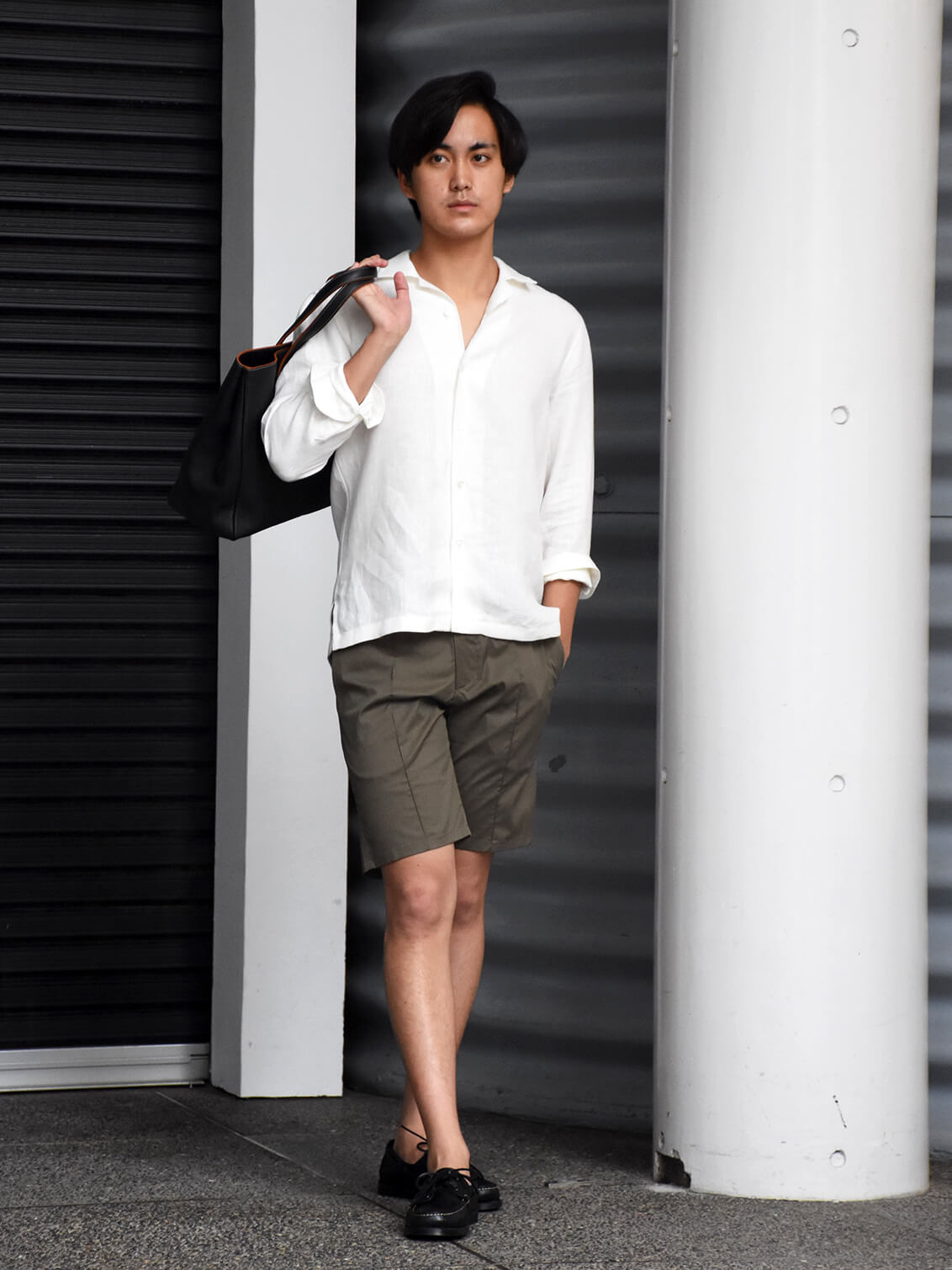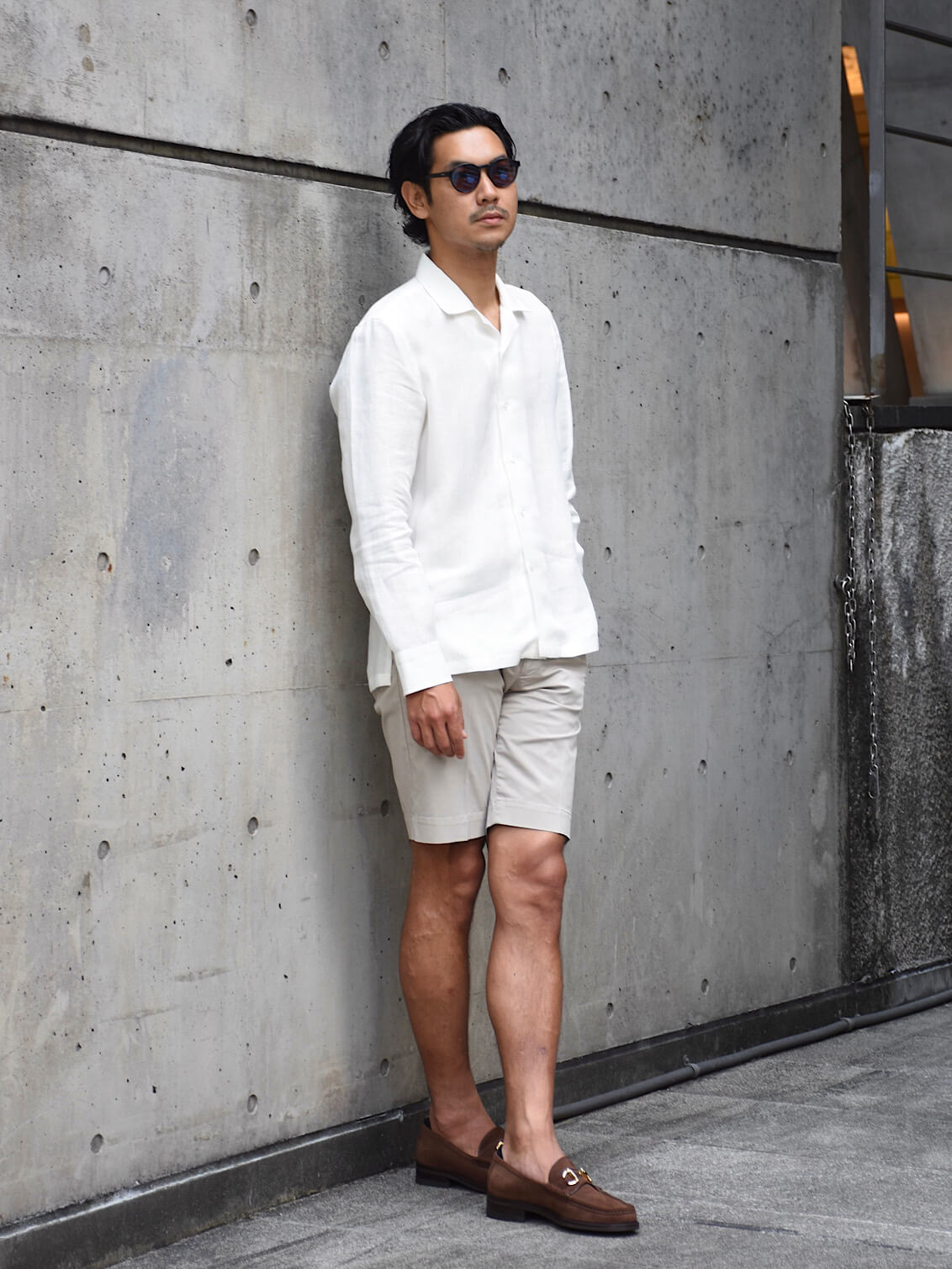 ・オフホワイトを着用し、カーキのショーツを合わせたスタイル / 身長180センチ/体重71キロで、着用サイズは40です。