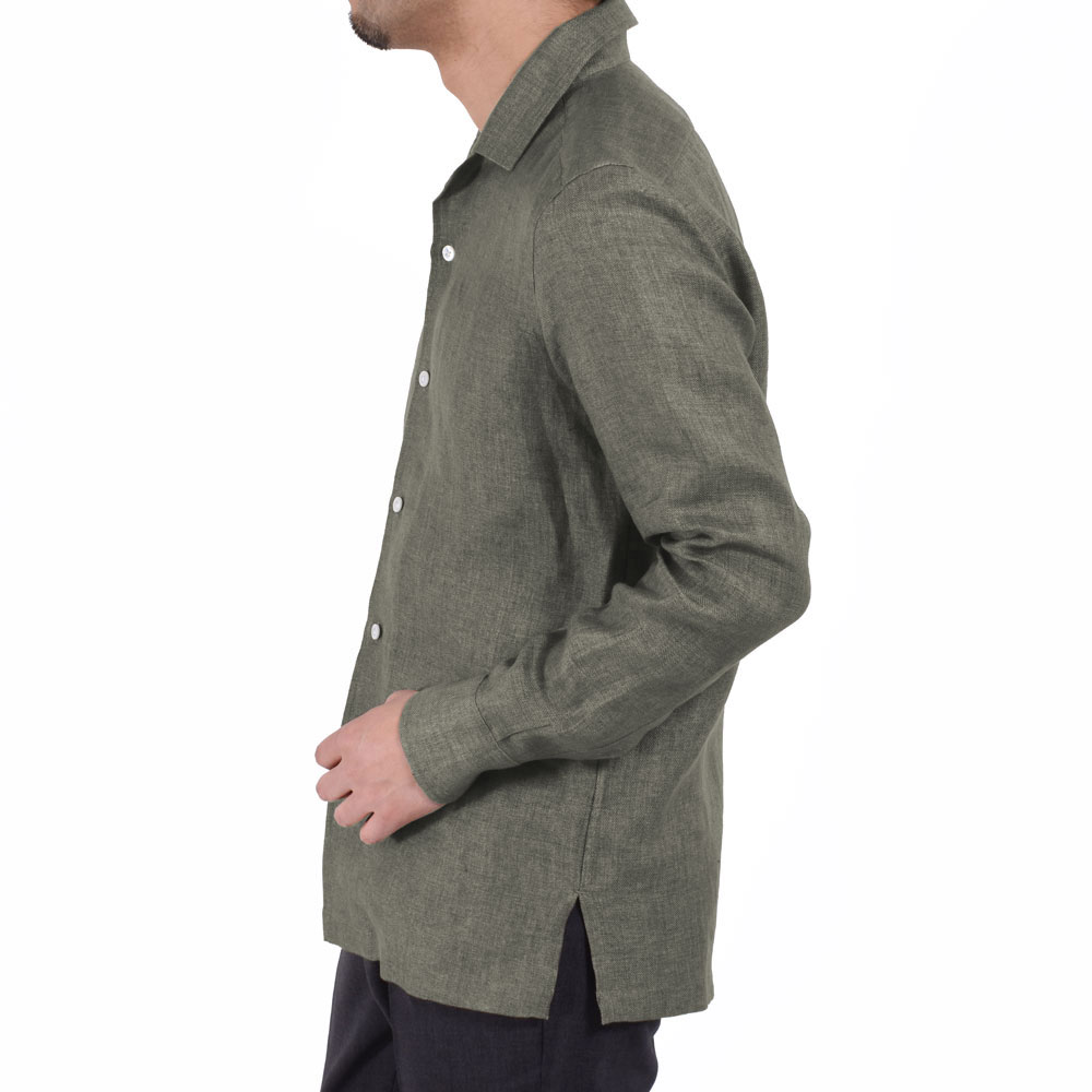 ・生地はイタリア三大シャツ生地メーカーのひとつと言われる「ALBINI(アルビニ)」社のもので、オーバーシャツとしても着られるようしっかり感のあるリネンを選びました。全3色のラインナップ。