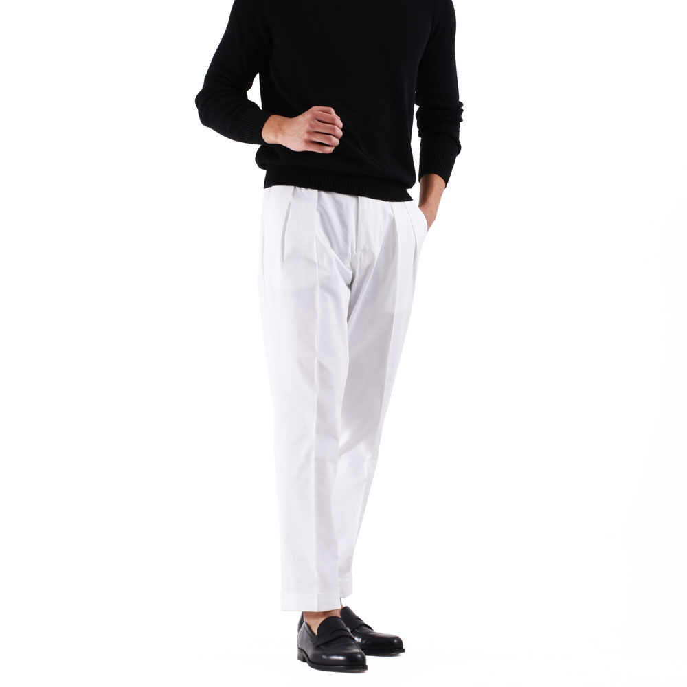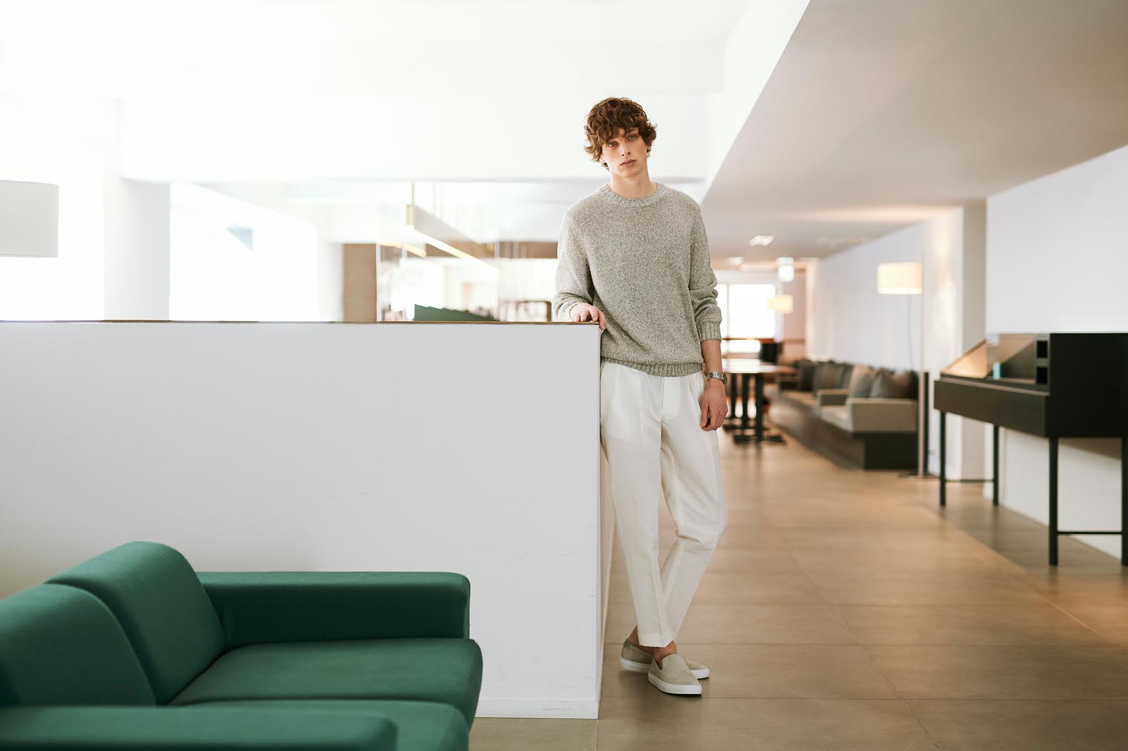 ・安定感ある股上の深さ、ワタリはゆとりがあるもののテーパード感の強いシルエットに仕上げられており、センタークリースが入っていることもあり、締まりがありつつリラックスしたシルエットと穿き心地が楽しめます。