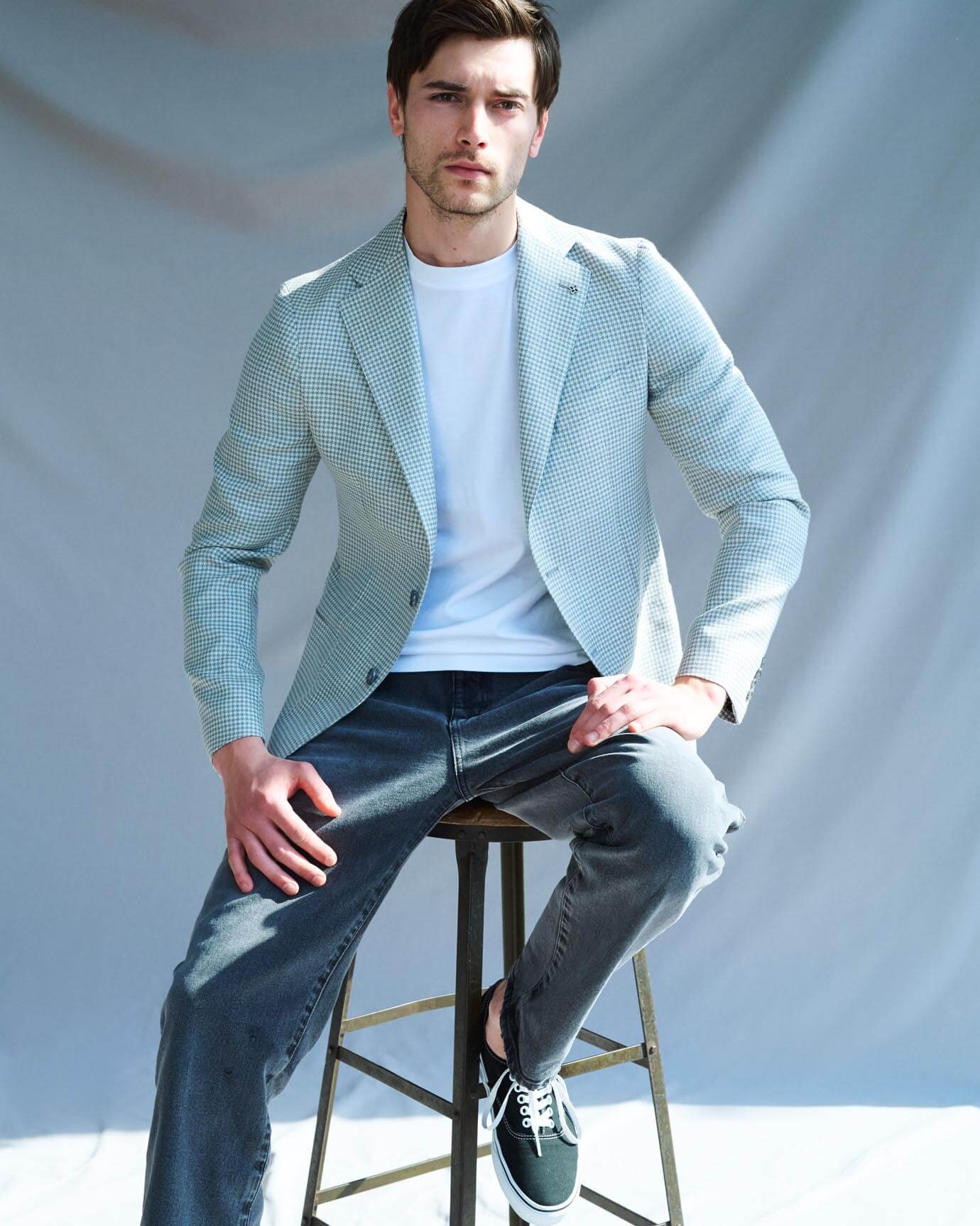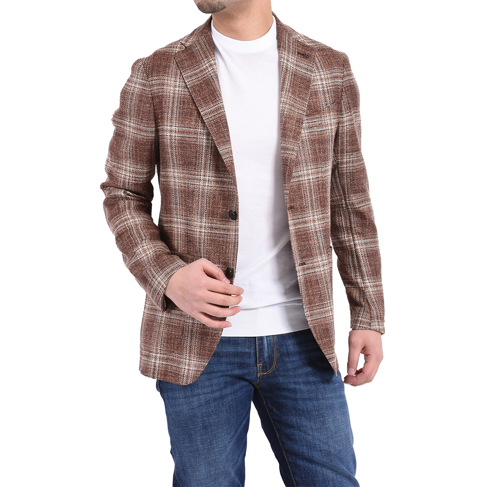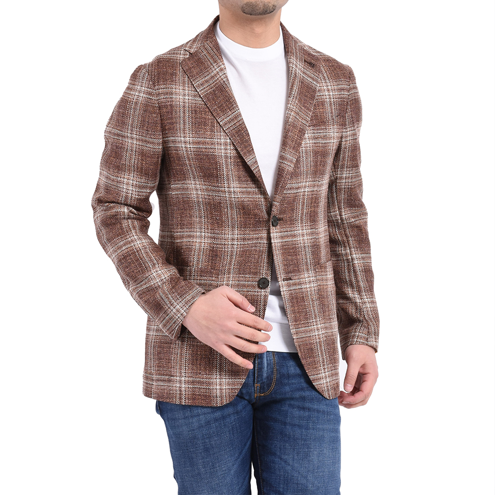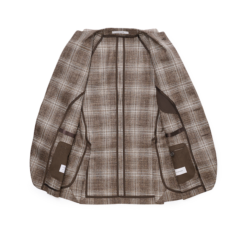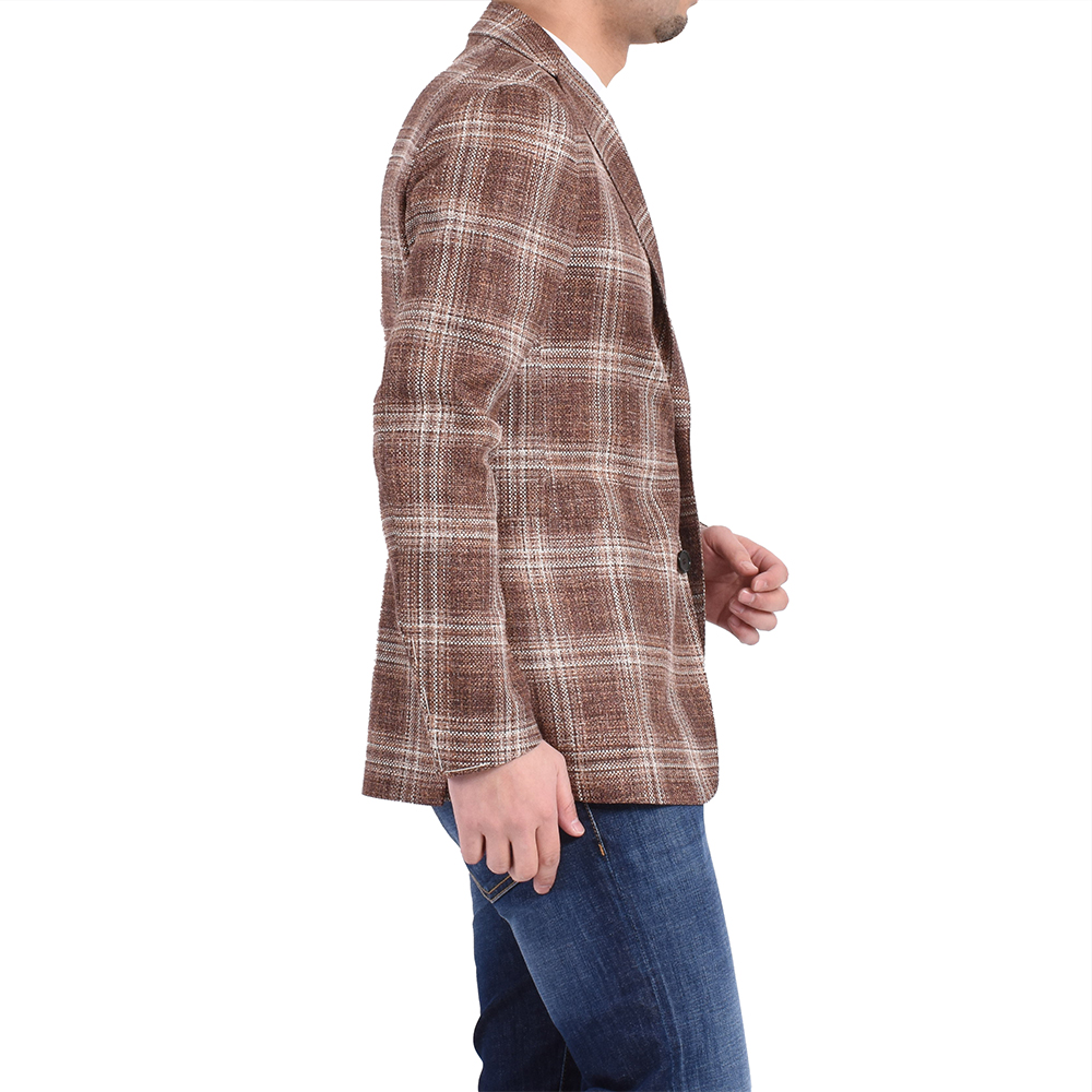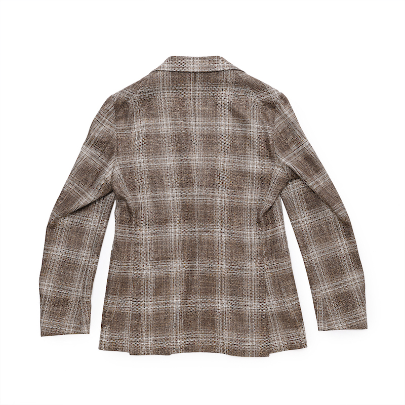 奥行きを感じる白とブラウンのチェック柄がこなれたムードを醸します。シルクが入っていることからほんのりと光沢がでて、自然光に当てると更に素敵にチェック柄が映えてくれます。かっちりとした見た目であるものの、裏地を省いた軽い仕立てになっているのでラクな着心地が◎。