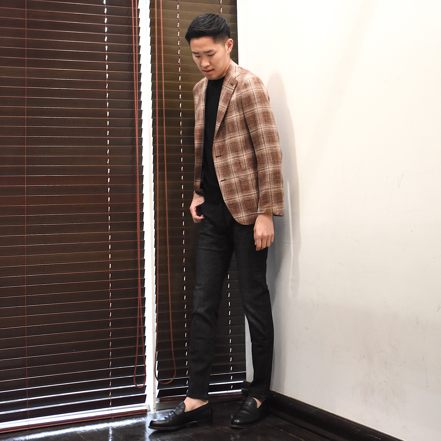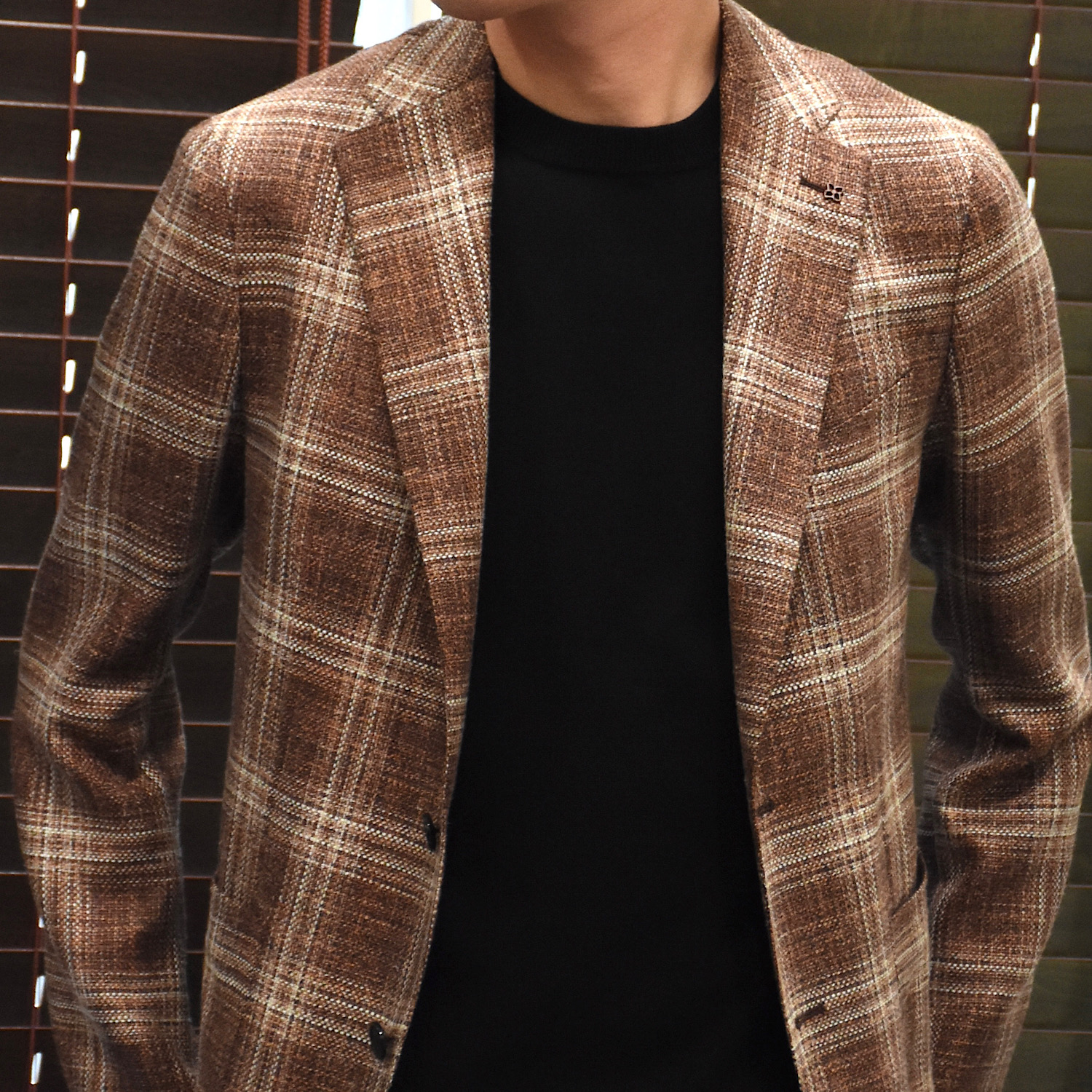 ・モデルは「TAGLIATORE(タリアトーレ)」が誇る軽量仕立ての"DAKAR"。形状保持とボリューム感を出すためにジャケットのキモとも言える襟、肩、バスト部分以外は一枚仕立てです。見た目は完全にジャケットなのに着心地はシャツ並みという軽量感をお楽しみ頂けます。