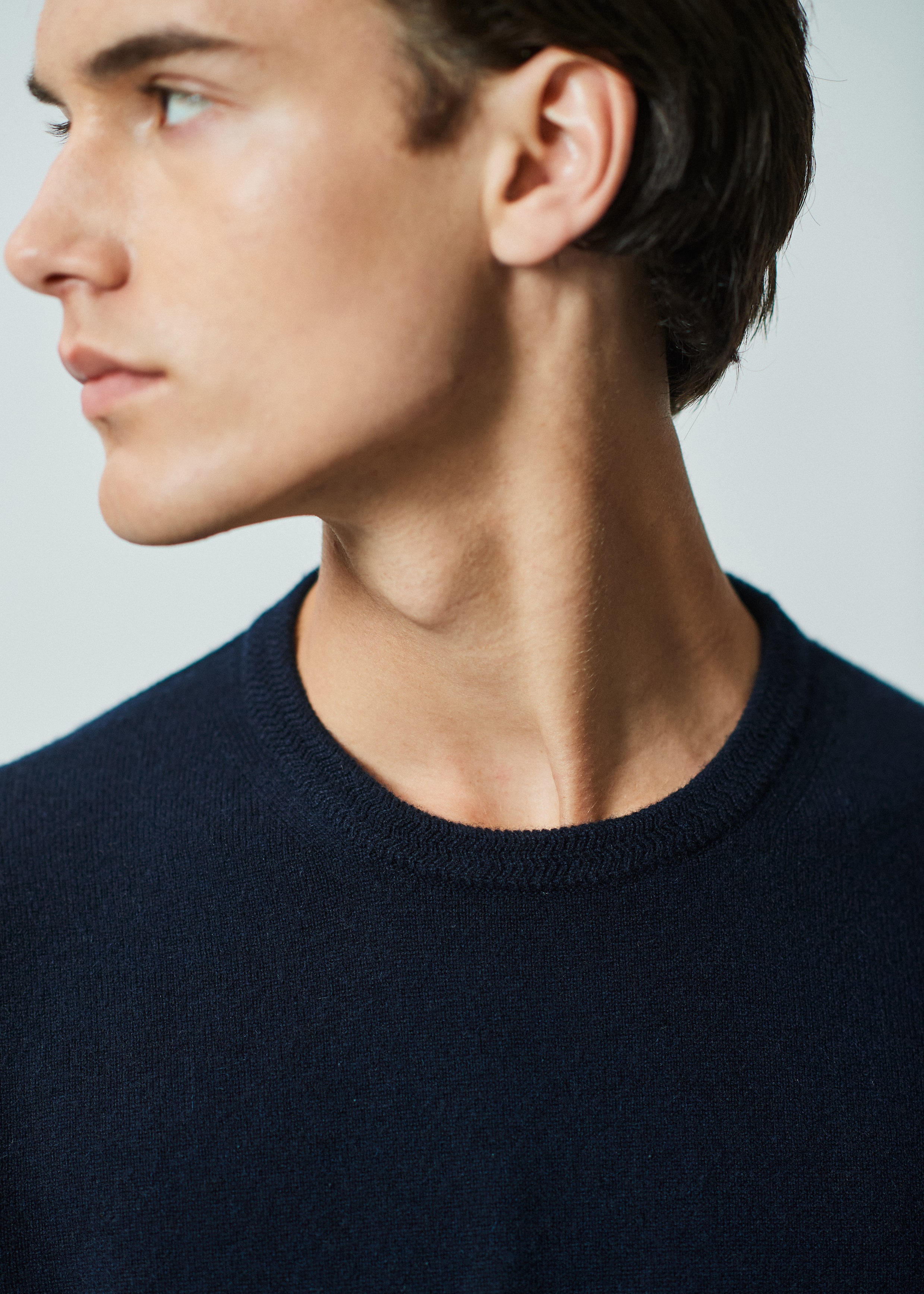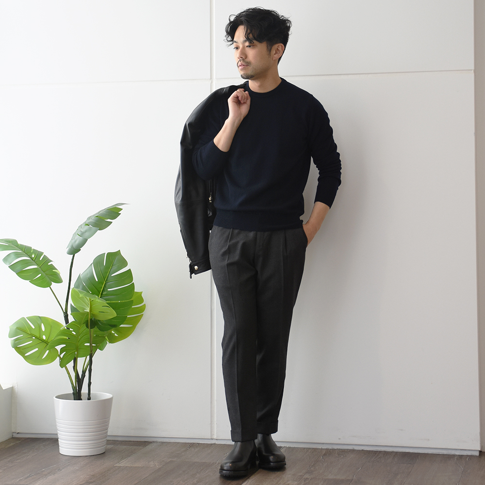 ふんわりとした”極上”の着用感でオーラがあります。ネックのリブは程よく存在感があり、一枚で着ても物足りなさを感じません。すっきりとしたシルエットなので、場合によっては普段よりワンサイズ上を選んでもバランス良く着こなせます。