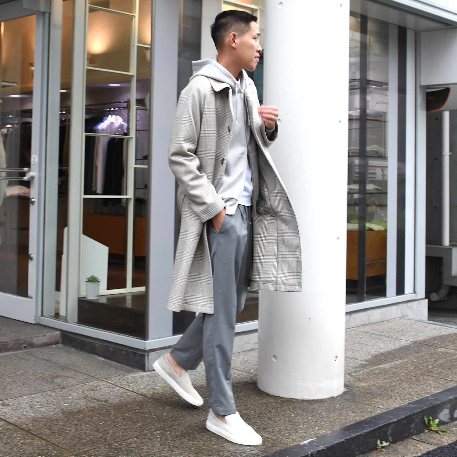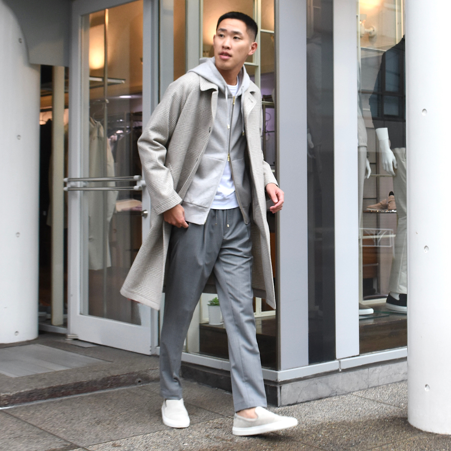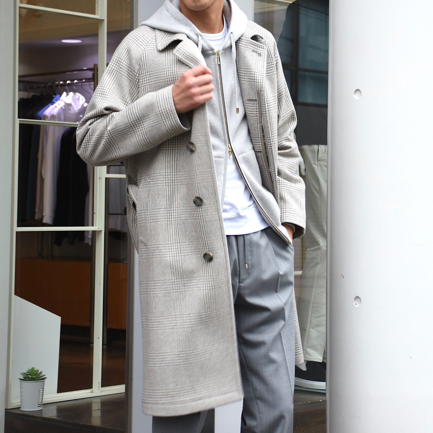 ・大柄なグレンプレイドは、グレージュとオフホワイトが組み合わされた色合いで実に洒脱。土臭くならず、着る人を柔らかく見せてくれます。