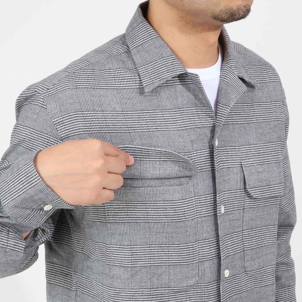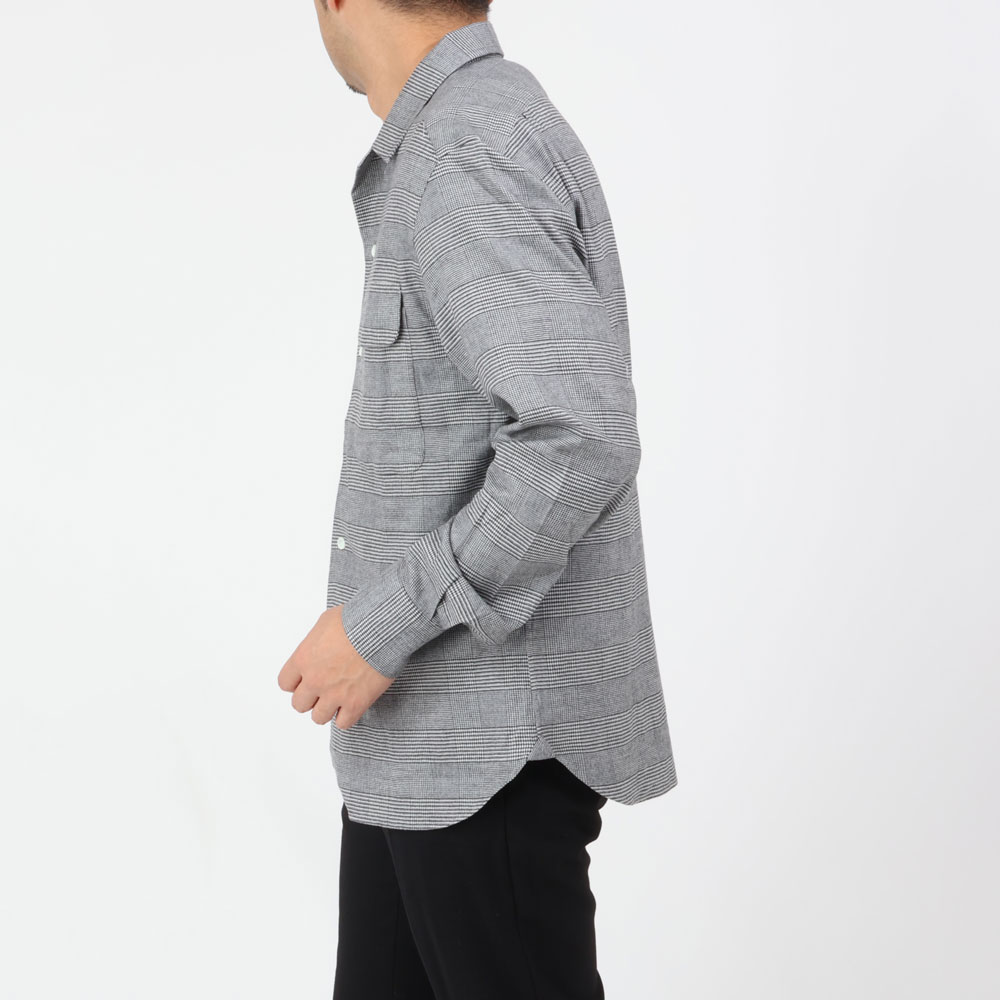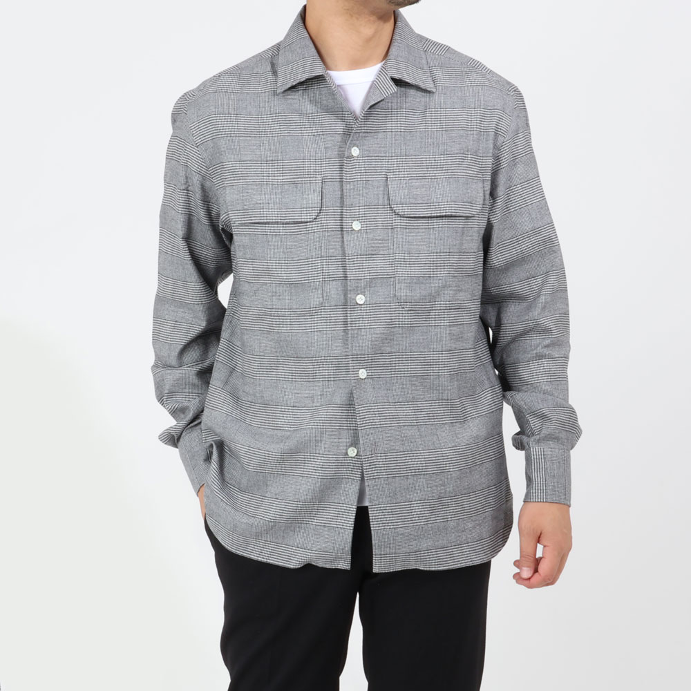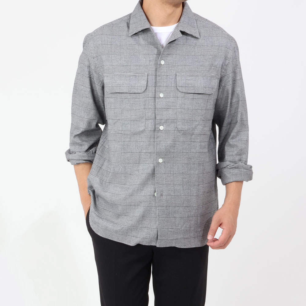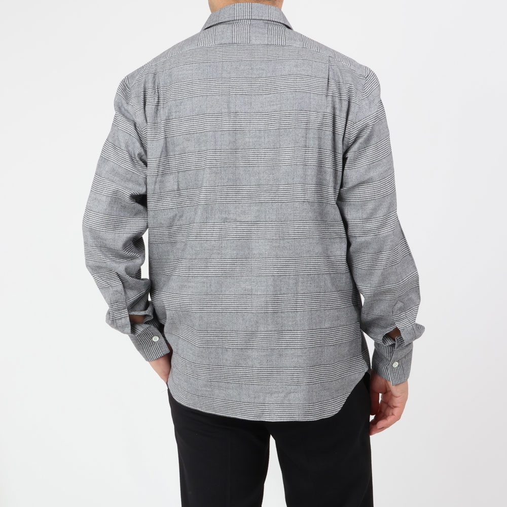 ・生地はコットンとリヨセルがブレンドされた、ほんのり起毛感のあるグレンプレイド。洗いが掛けられており、柔らかな風合いと程よい厚みですので、秋口から春先まで長く着られるのも特徴です。
