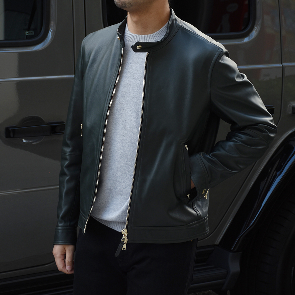 ・レザーの色合いにもご注目ください!深みのあるグリーンとブラウンのため、ブラックが合うのはもちろんのこと、ネイビーやグレー、そしてベージュのインナーやボトムズとコーディネートできます。レザーの色合いだけでさりげなく、でもいつもと異なる新鮮なスタイリングが完成します。