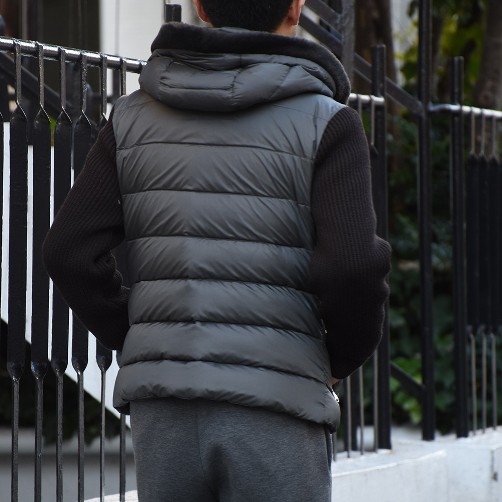 ・身頃のみがダウンなので温暖化傾向のある現代でもオーバースペックにはならず、伸縮性に富んだニットスリーブで動きやすく、ムートンによりラグジュアリーさが加えられた、というまさにハイブリッドアウター。