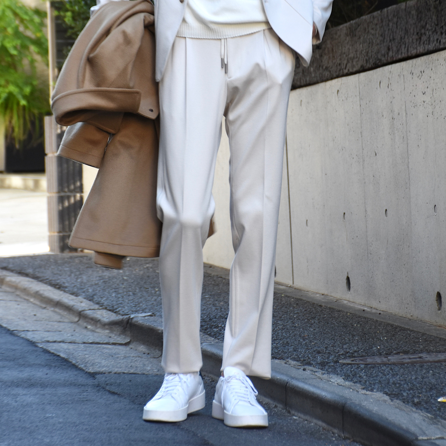 同素材のジャケットとセットアップでの着用はもちろん、単品使いでも活躍する大人のワードローブにふさわしいパンツです。