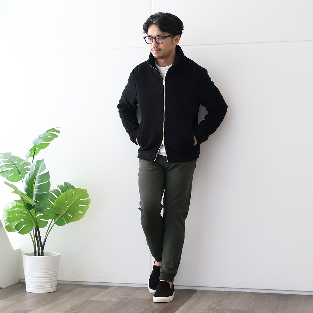 • ウエストコンフォートバンド、1プリーツ、フロントジップ、裾口リブ(リブ幅4.5cm)、サイドアジャスター仕様