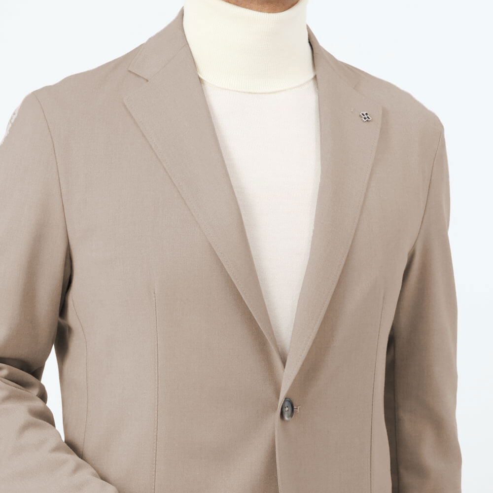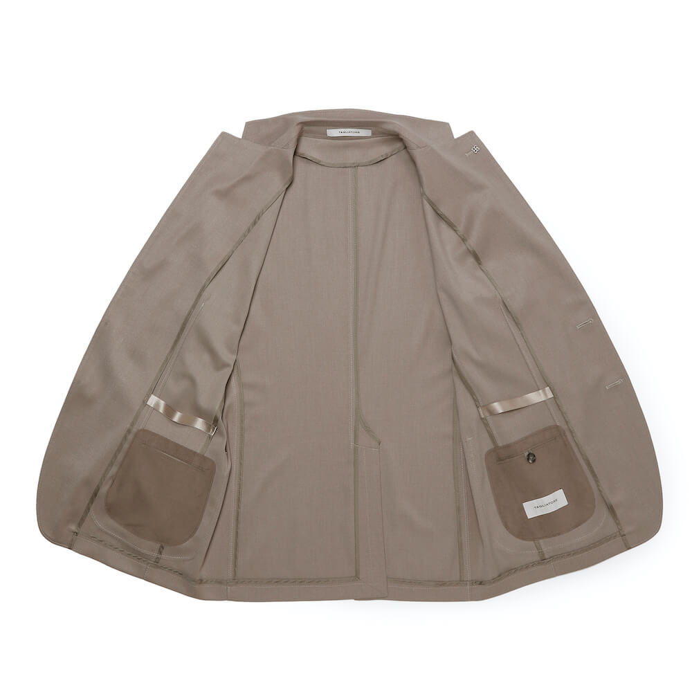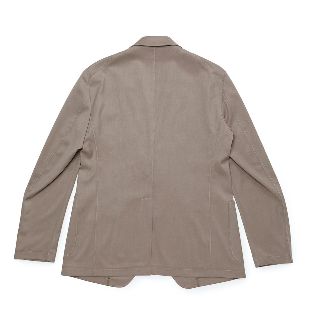 ・形状保持と立体感、そし着心地を良くするためにジャケットのキモとも言える襟と(前身頃の)見返し以外は一枚仕立て。裏地と胸ポケットを省き、筒袖が採用されています。袖丈が合えば、お直し無しで着られるお手軽な一着。極めて軽く柔らかな着心地が特徴です。