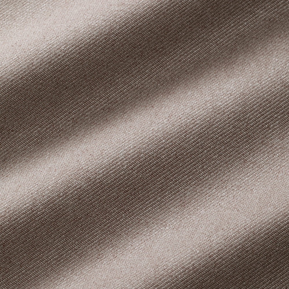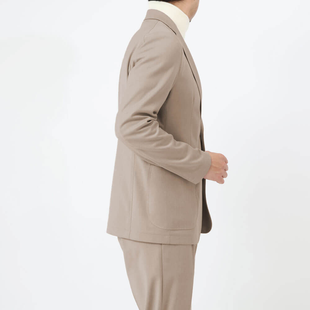 ・生地はポリエステルにレーヨンをブレンドし、ストレッチを効かせたもの。ウールサージのようなしなやかで微光択のある風合いが軽い仕立てと好相性。目付けは400グラムです。