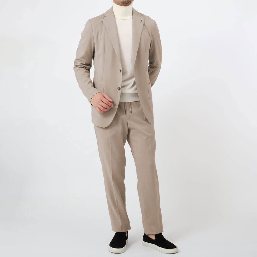 ・カジュアル感ときちんと感が両立されたセットアップ。良い意味で季節感の薄い夏以外は着られる生地になります。ダークブラウンとグレージュのラインナップ。同生地のパンツ(50,600円はこちらから。
