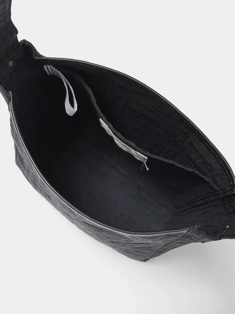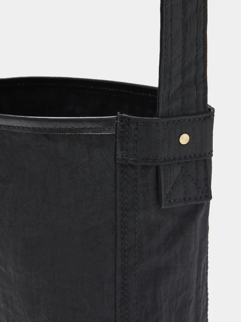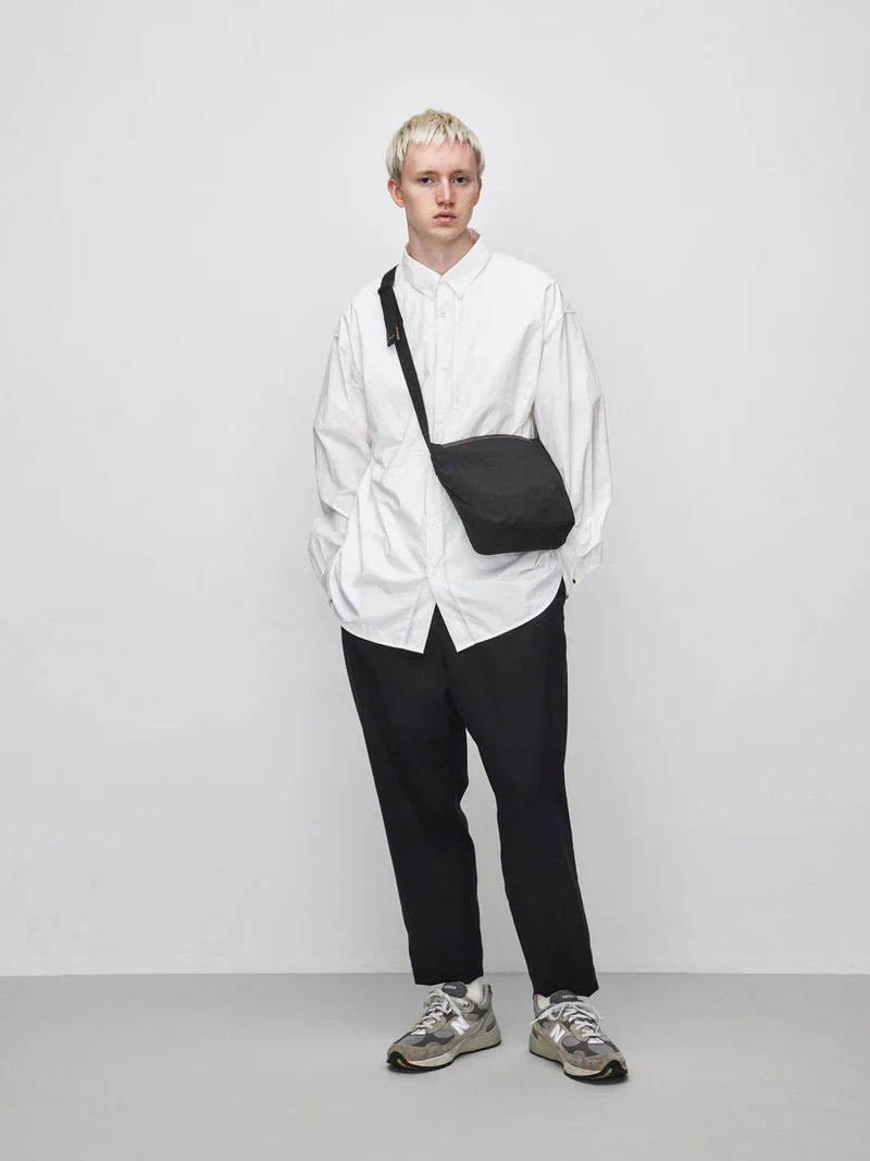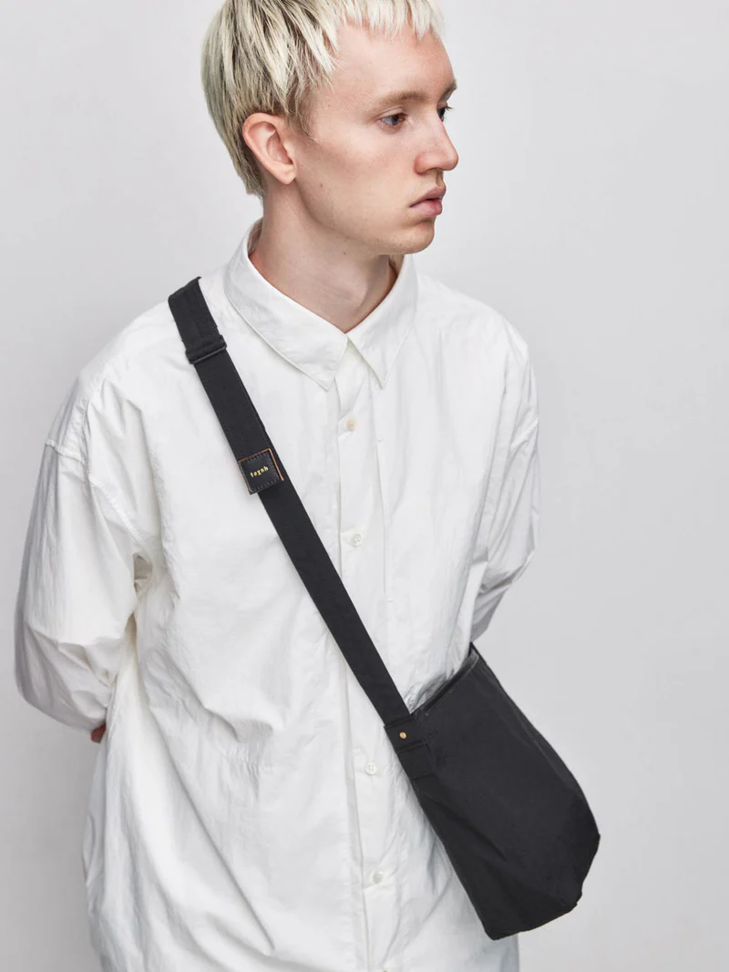 素材の風合いを生かすため裏地を付けず、超軽量に仕上げている。また、付属革には”丘染め”と呼ばれる芯の茶色を残した染色が特徴のヌメ革を使用し、切り目を生かしたディテールもポイントにしている。 ポストマンバッグをモチーフにした"手紙を運ぶ"小さなショルダーバッグ。