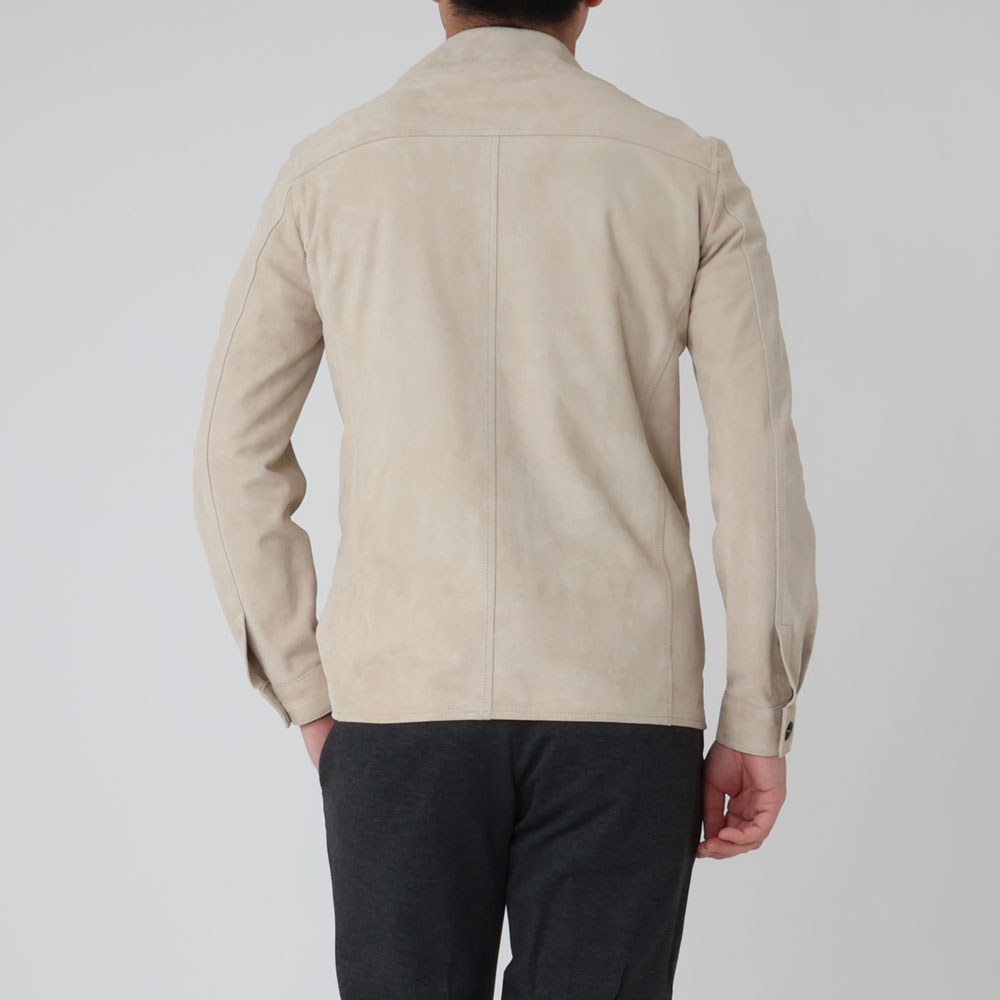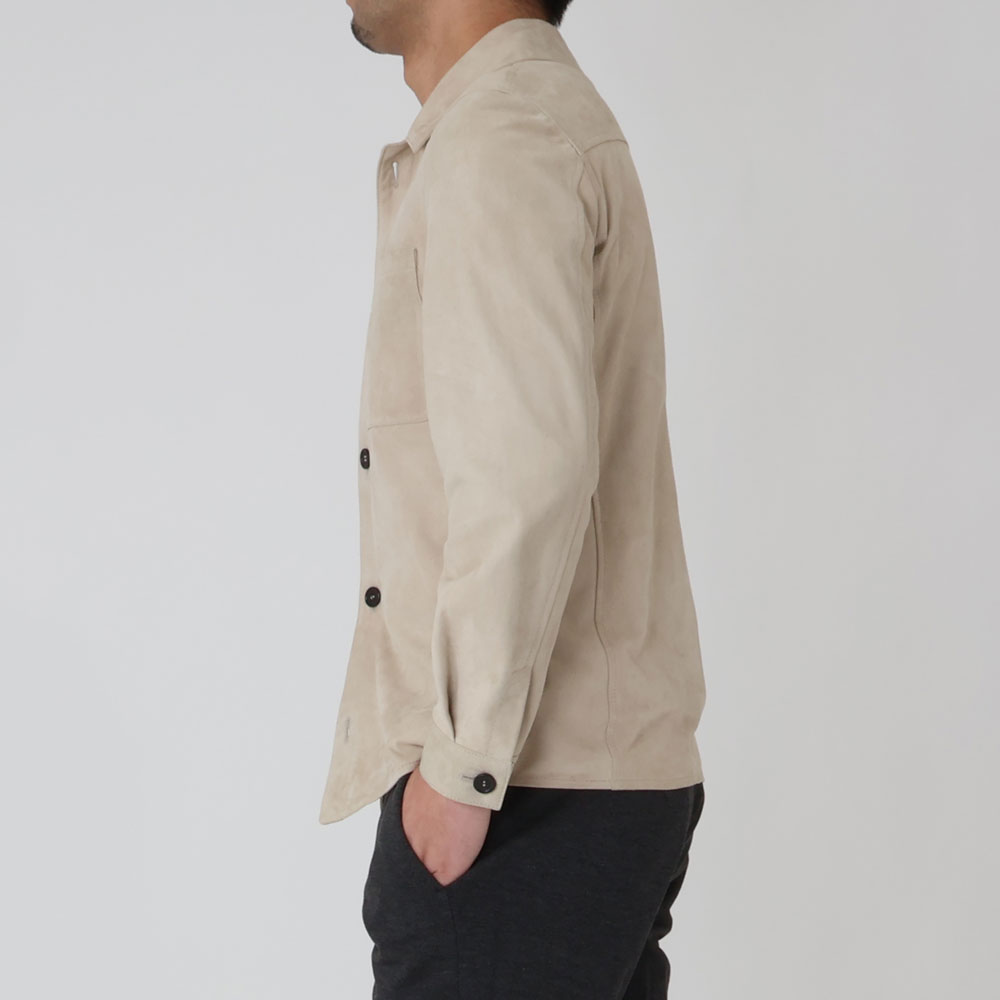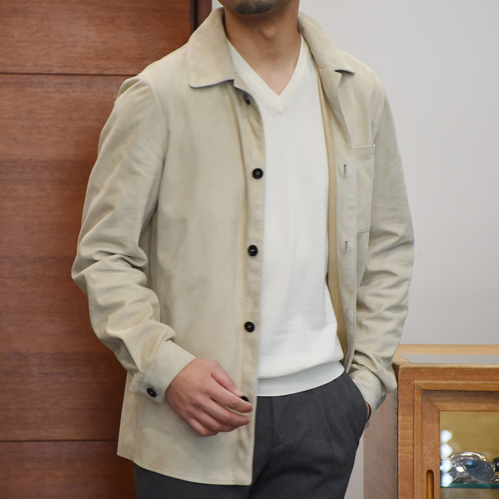 ・”PIUMA”は、極めて軽い着心地を実現することにこだわり、仕立てられたオーバーシャツ。滑らかで薄手のラムスウェードをアンライニング(裏地無し)で仕立て、素材や色合いの良さが際立つよう削ぎ落とされたシンプルなデザインとなっています。