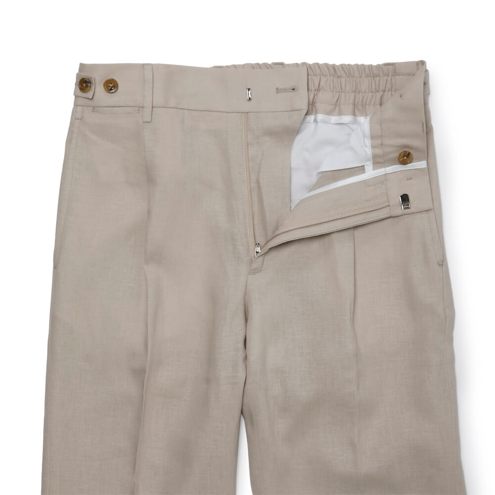 ・生地はリネンとヴィスコース(レーヨン)がブレンドされたキャンバス織り。薄手でリネンの清涼感とヴィスコースのトロみを持ち合わせており、夏向きの涼しい穿き心地です。全4色(ブラック/ネイビー)のラインナップ。