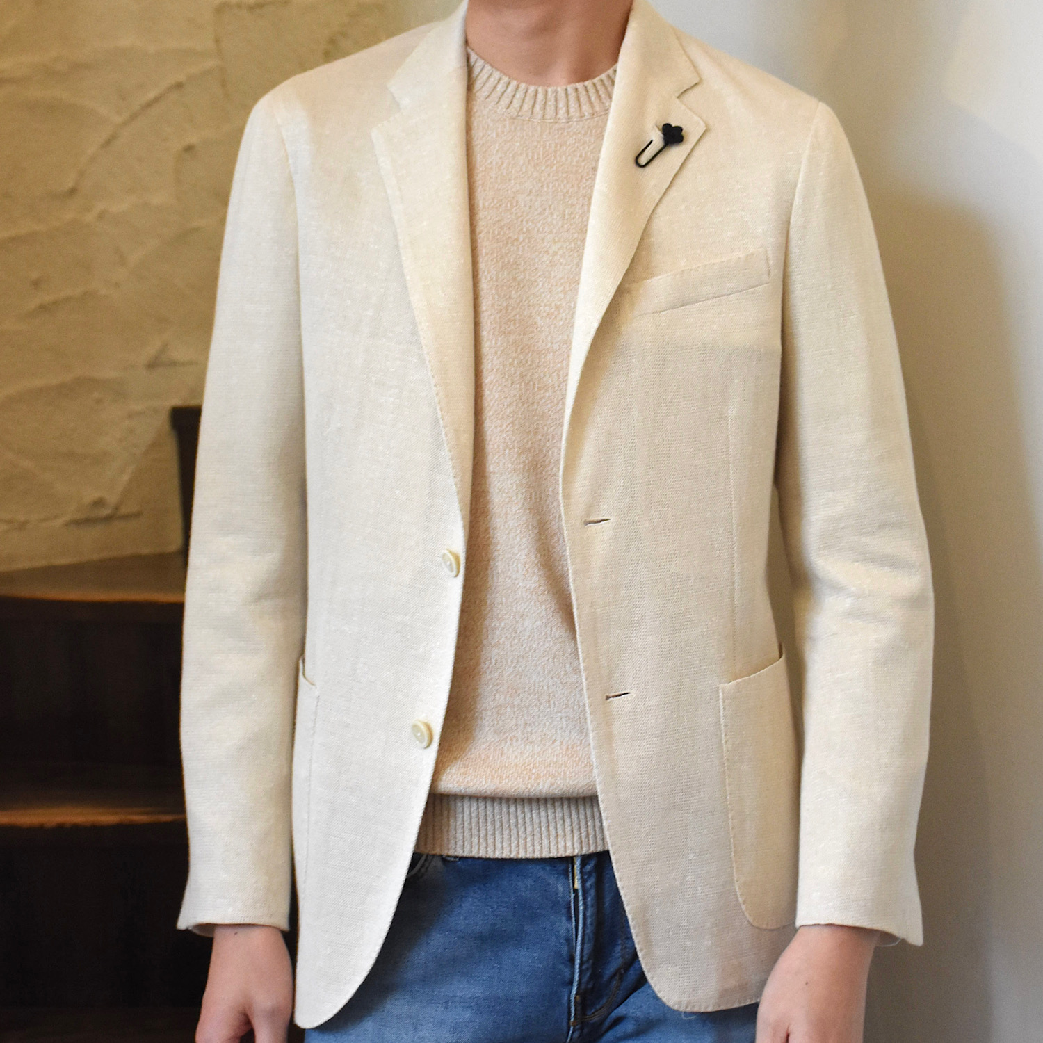 ・ニット地で且つ芯地が使われていないのにも関わらず、ショルダーラインの美しさや立体的なラペルの返りに「LARDINI(ラルディーニ)」の高い技術力が現れています。