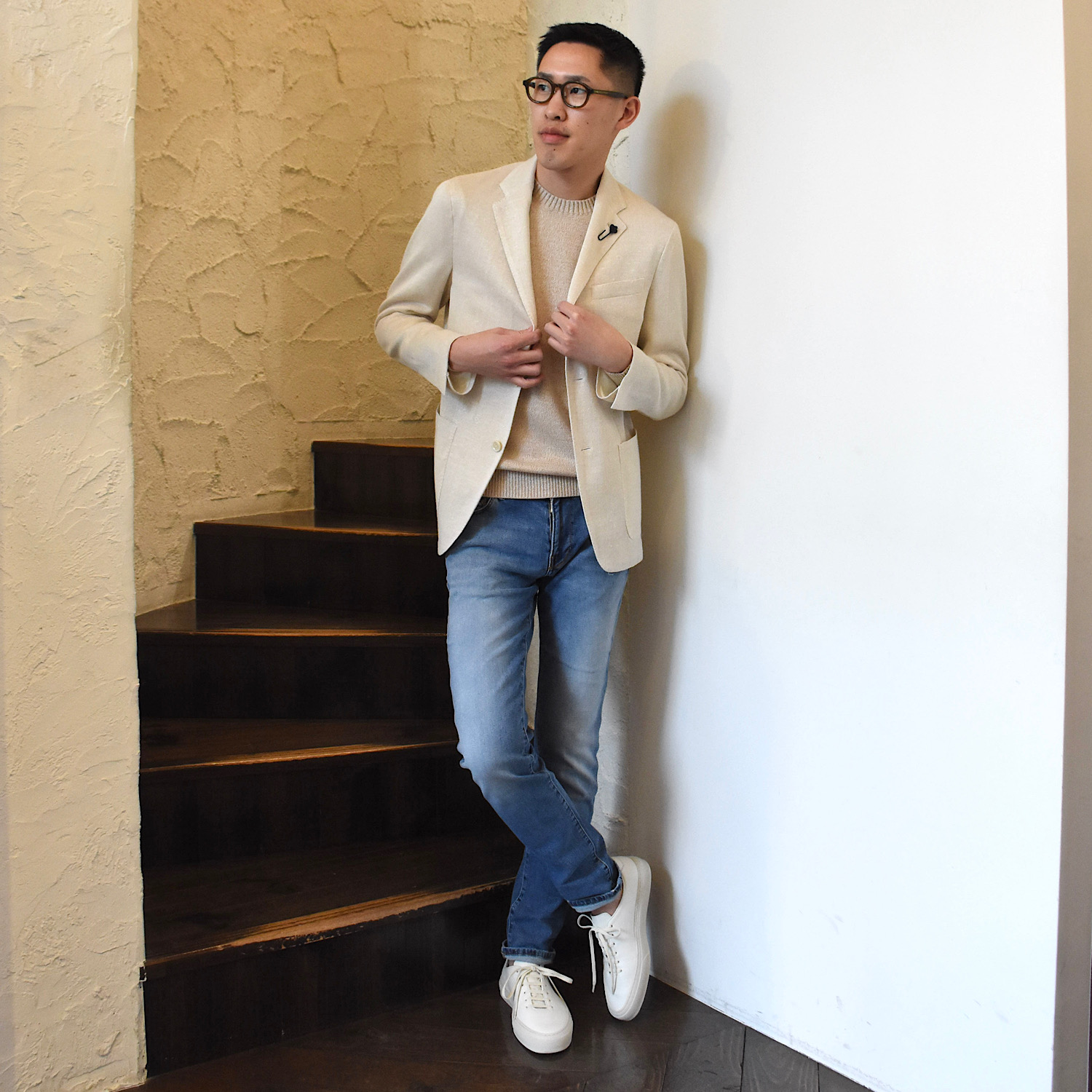 このジャケットには「自分をワンランク上へ連れていってくれる」ような高揚感があり心を奪われました。エレガントでありながら柔らかな色合い、抜け感のあるリネン混素材、軽やかなニットのバランスが秀逸で、羽織るだけで一気に格上げしてくれます。過度に飾らずスマートな佇まいも魅力です。ニットやシャツの上からサイズ44を着用し、ちょうど良いサイズ感でした。
