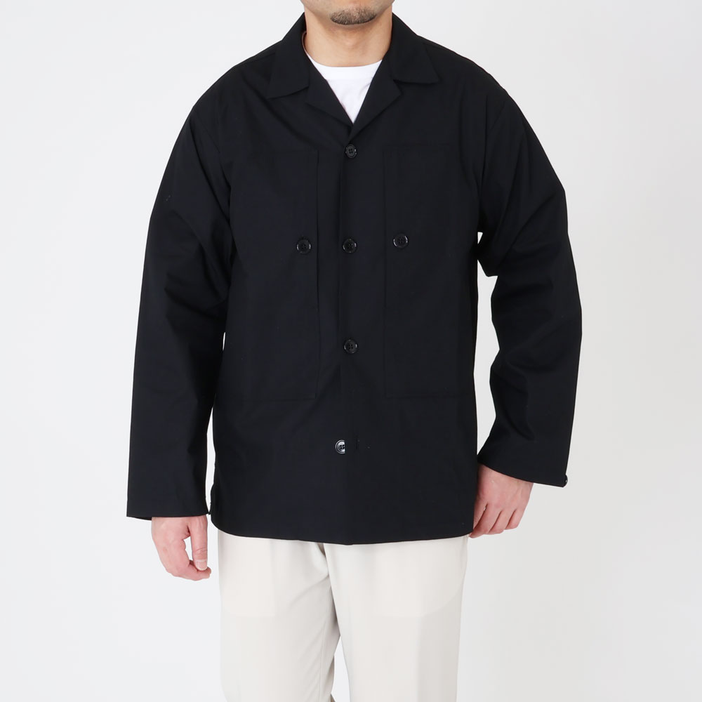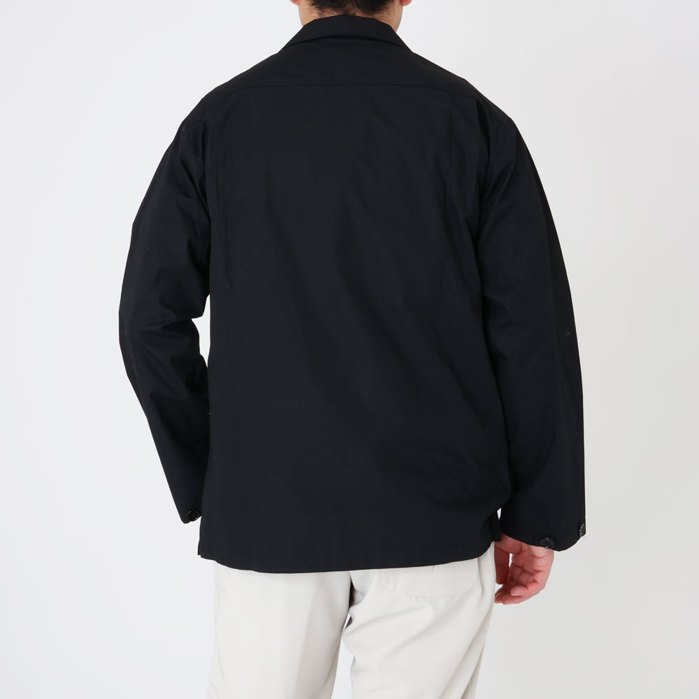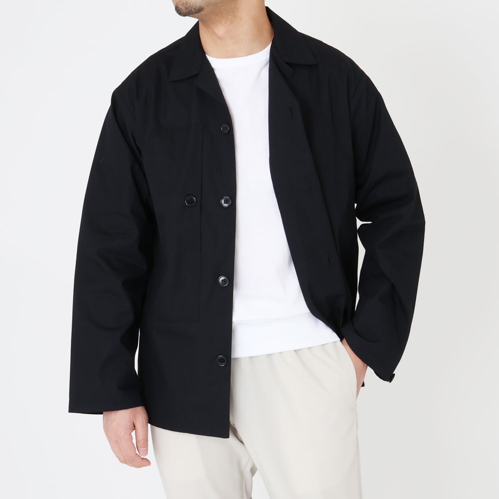 ・ミリタリーパンツのポケットからモチーフを得たような胸ポケットが目を惹くこちらはオープンカラーのシャツジャケット。直線的でゆとりあるパターンにより適度にオーバーサイズ感のあるシルエットを描きます。