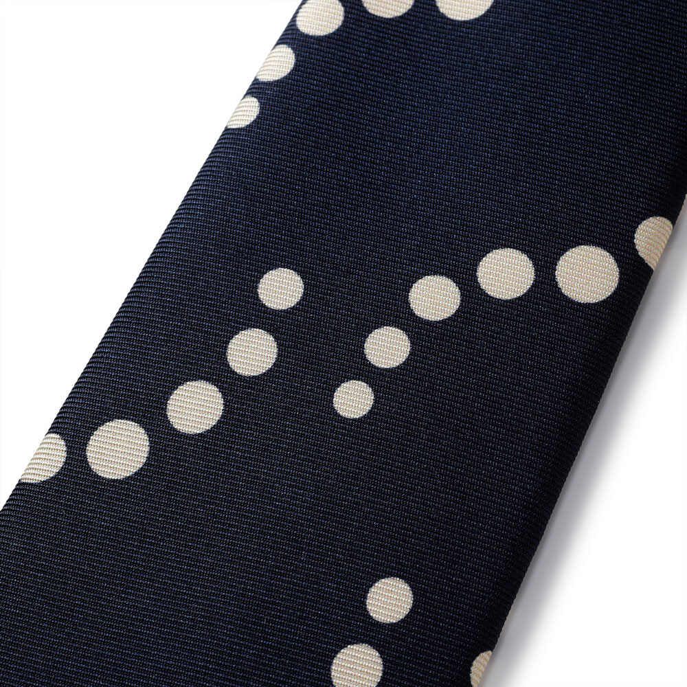 大小のドットが波のように描かれた、遊び心あふれるデザイン。ジャケパンスタイルにはもちろん、軽やかに見せたいビジネスカジュアルにもぴったりです。堅くなりすぎず、大人の品格をさりげなく演出してくれる、洗練された一本です。